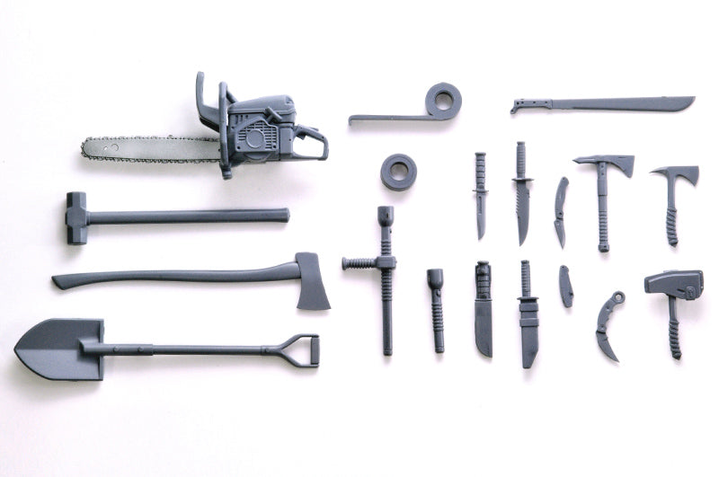 • 今作は「白兵戦」がテーマ。白兵戦で使用される各種近接武器と、塹壕構築などで使われる工具を1/12スケールで模型化しました。