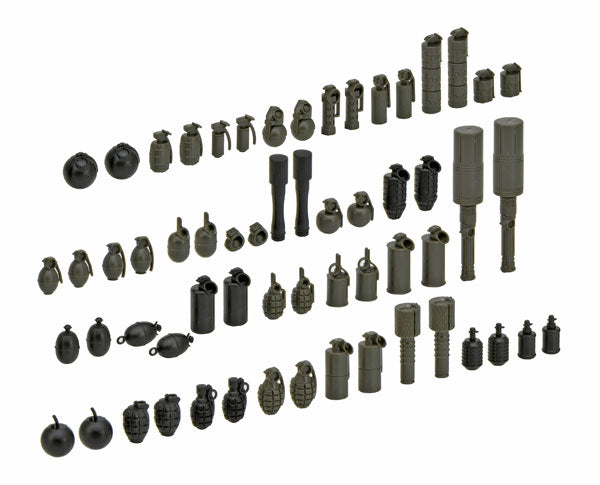本製品は、古今東西30種類の手榴弾を1/12スケールで再現。ベーシックな破片型手榴弾、ガス弾、スタングレネード…etc。殆どが一体成型で簡単にフィギュア遊びに活用できる一方、塗装や付属デカールで仕上げると密度感のある精密ミニチュアとして楽しむことも出来ます。説明書に塗装図を兼ねた解説を掲載!◆まるでミニチュアグレネード図鑑!全30種