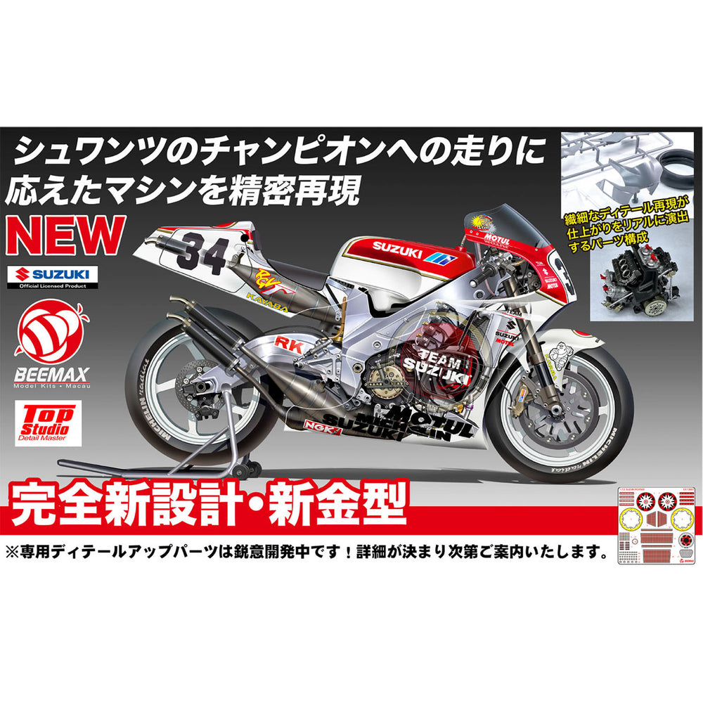 1993年のロードレース世界選手権でチャンピオンに輝いたケビン・シュワンツがライディングしたスズキRGV-Γ(XR79)を再現したプラスチックモデル組み立てキットです。スケールは1/12。ツインスパーフレームに前後サスペンション、V型4気筒エンジンまで、レーシングバイクのメカニズムを詳細に再現しています。2ストロークエンジンならではの独特な形状の排気管、チャンバーもその形状を正確にモデル化。フレームはツインスパータイプのデザインをしっかりと再現。チェーンは貼り合わせの2パーツ構成でチェーンの隙間も表現され、正確にモデル化されたスイングアームなどとともに仕上がりの実感を高めます。エンジンの取り付けやカウルの取り付けには小型の金属ビスなども使用して組み立ても確実。BEEMAXが初めて取り組むバイクモデルの仕上がりにご注目ください-