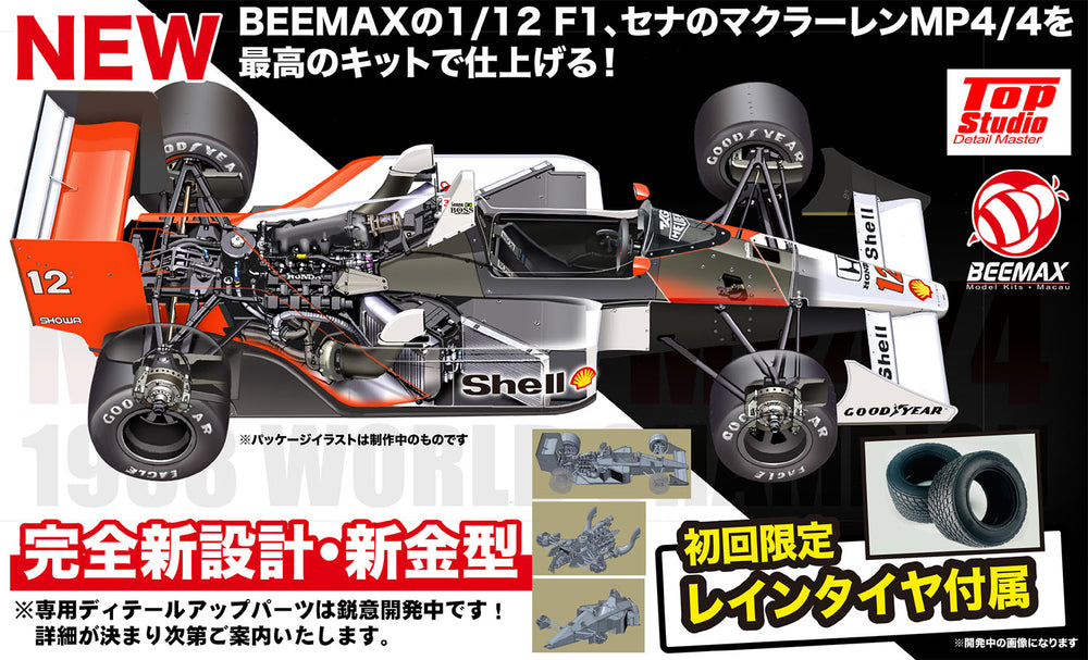 ●専用ディテールアップパーツセットも同時発売。後日詳細はお知らせします。●BEEMAXの1/12 F1、マクラーレンMP4/4を最高のキットで仕上げる!初回限定のレインタイヤが嬉しいキット