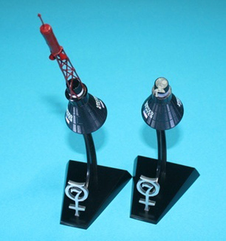 モデルはプラスチックパーツのほかエッチングパーツも組み合わされ、宇宙船本体と打ち上げ時にその先端部分に装着されていた緊急脱出用ロケット、LES部分までを繊細に再現。