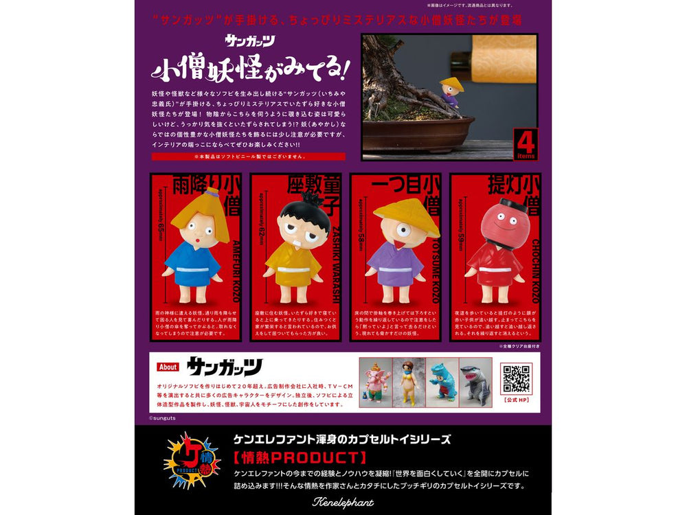 妖怪や怪獣など様々なソフビを生み出し続ける『サンガッツ』が手掛ける、ちょっぴりミステリアスでいたずら好きな小僧妖怪たちが登場!