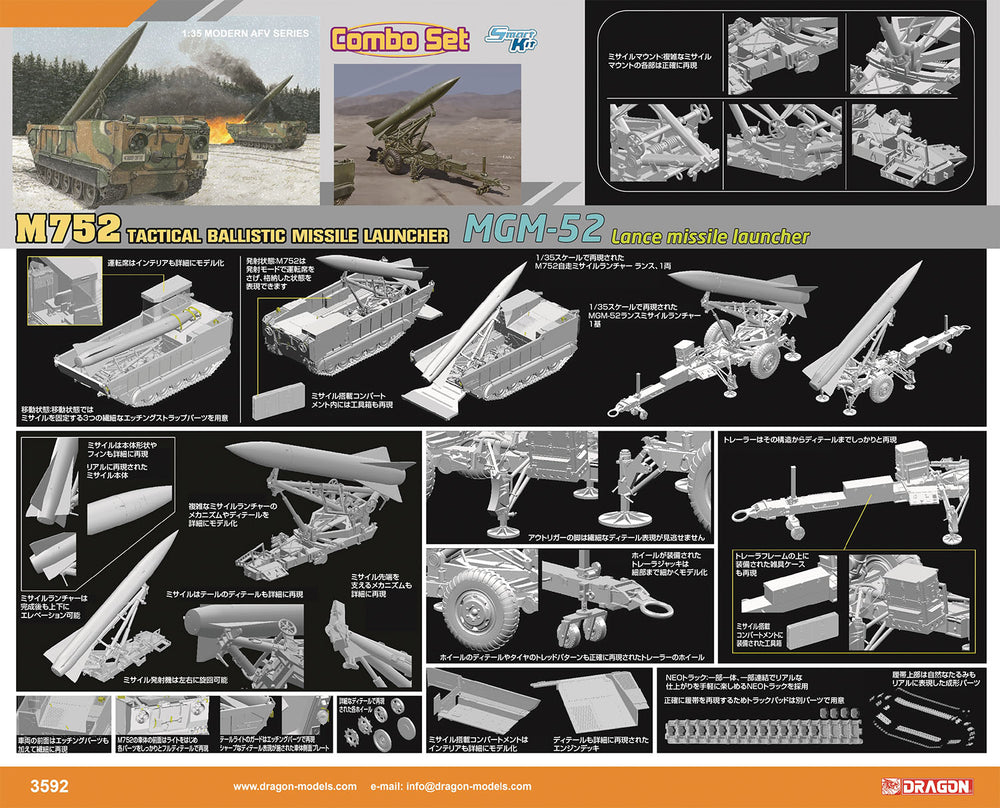 モデルはアメリカ軍が1970年代に開発した自走式ミサイル発射機、M752自走ミサイルランチャー ランスと移動式ミサイルシステム、MGM-52ランスミサイルシステムを1/35スケールで再現したコンボセットです。M752ミサイルランチャー ランスは車両形状のみならず、ミサイル発射装置も詳細に再現。移動中の状態とミサイル発射時の状態を選んで組み立て可能です。ミサイルランチャーは上下可動。発射状態では車体後部ランプも開いた状態に、また運転席部分も屋根を下げた状態を再現します。履帯は一部一体、一部組み立て式のNEOトラックを採用して足回りもリアルに再現。