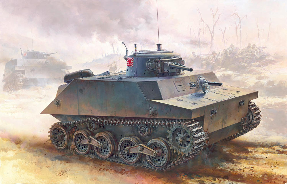 第二次世界大戦で日本海軍が陸戦隊の装備のひとつとして陸軍の協力のもと開発、装備したのが水陸両用戦車の特二式内火艇(カミ)です。ベースとなっているのは陸軍の九五式軽戦車で全面的に溶接構造を採用しハッチにはゴムシールを装備していました。砲塔は二式戦車の砲塔を使用。主砲は一式37mm戦車砲を装備。車体の前後には浮力を得るための着脱式のフロートを装備し、水陸両用の走行が可能でした。フロートは上陸後に外され、通常の戦車として進撃を続けたのです。1942年に制式化され、終戦までに約180両を生産。サイパンで実戦に初投入されるとニューギニアなど、南方の島々を舞台にした各戦場で活躍したのです。モデルについて