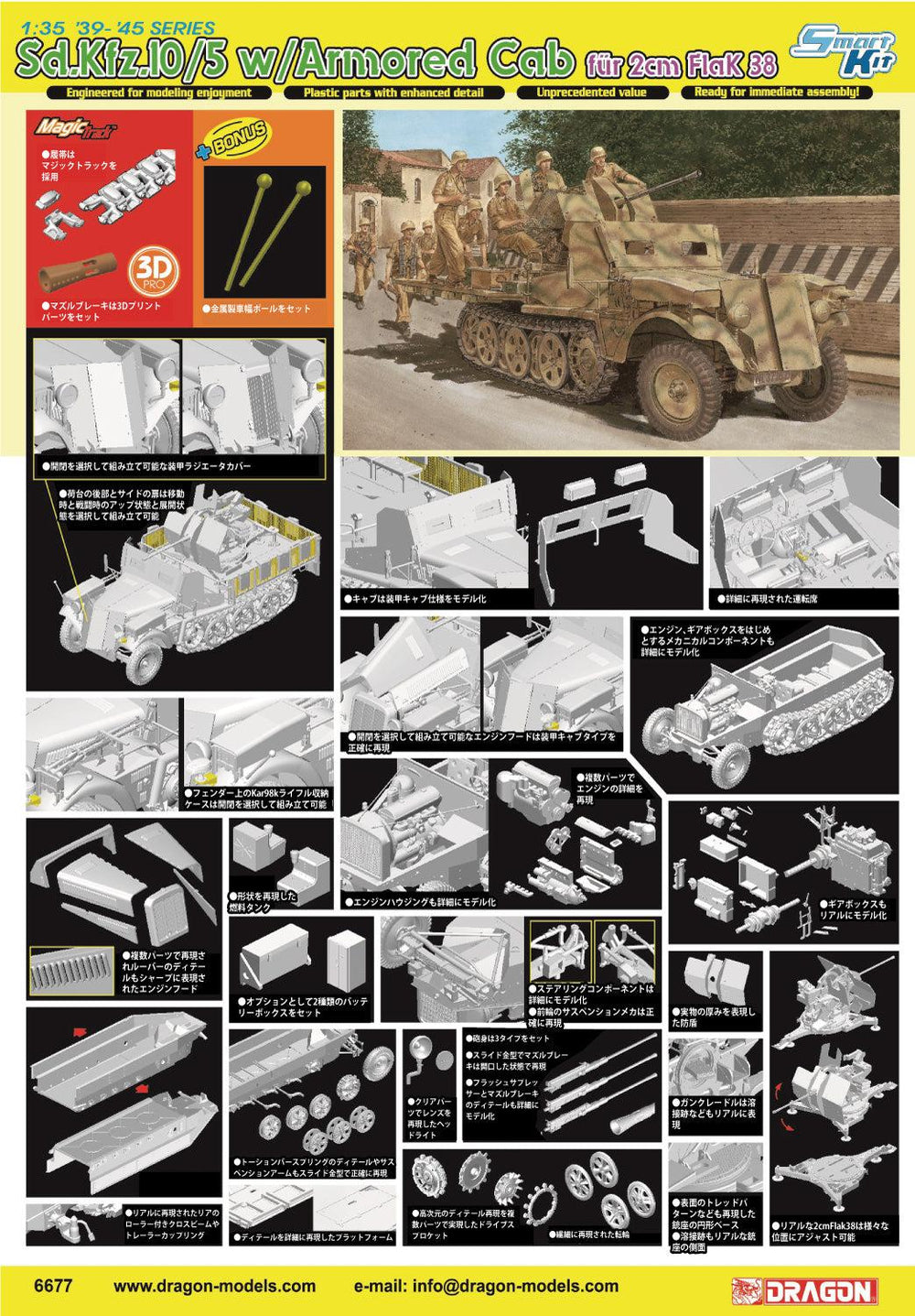 第二次大戦でドイツ軍が配備した1トンハーフトラックの2cm対空機関砲Flak38搭載型、Sd.Kfz.10/5を再現したプラスチックモデル組み立てキットです。スケールは1/35、仕上がり全長は約13cm。力強さも伝わる装甲キャブ仕様をモデル化しています。また、キットの履帯はリアルな仕上がりの組み立て式マジックトラックを採用し、Flak38対空機関砲のマズルブレーキには3Dプリントパーツを用意してシャープな仕上がりを演出するなど、リアルな仕上がりが楽しめる内容が魅力のキットです。車台はスライド金形を使った一体成型の車体下部にトーションバー式のサスペンションメカをロードホイールやドライブスプロケットなどとともに詳細に再現。さらに、フロントのエンジンフードパーツは開閉選択可能で内部にはエンジンをフルディテールでモデル化。運転席もリアルな車体はリヤに専用のプラットフォームと2cm対空機関砲Flak38を再現。バレルは3種類がセットされ、選択して組み立て可能。また、プラットフォームのゲートは開閉選択式。前輪のフェンダー上には内部にKar98kライフルを収納するケースもセット。ケースは閉じた状態、あけた状態が選べます。内容豊富なキットです。-