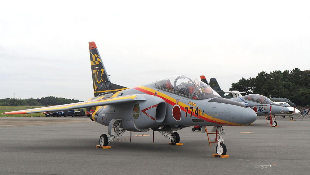 T-4はプロペラ機での初等訓練を終えた航空自衛隊搭乗員がジェット戦闘機の訓練へと進むための中等練習機で、T-33A練習機の後継として日本が開発した亜音速ジェット機です。低速から高速(遷音速)までの安定した飛行を実現するため、新しい遷音速翼型が採用されたのが特徴となっています。その安定した飛行性能で航空自衛隊の各部隊で1988年より部隊配備が開始されましたが、アクロバット飛行チーム、ブルーインパルスでも使用されています。2024年は航空自衛隊70周年を記念して各基地での航空祭には記念塗装機が登場しました。2024年10月27日に開催された虚空祭、エアフェスタ浜松ではオレンジとレッドのストライプも目を引く特別塗装が施されたT-4が披露されて注目を集めたのです。モデルについて