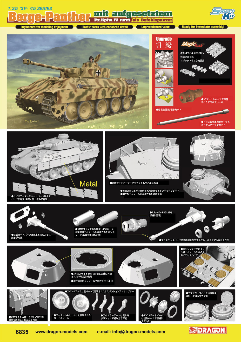 モデルはこの非常に珍しい1両のみが存在した第二次大戦ドイツ軍車両、ベルゲパンターIV号戦車砲塔搭載型を1/35スケールで再現。車体は傾斜装甲を採用した形状をはじめ、車体側面には金属パーツでシュルツェンを1枚1枚分割でモデル化しています。砲塔はIV号戦車の砲塔をスライド金型により形状を確実に再現。主砲、7.5cmKw.K40L/43の砲身はアルミ削りだしパーツ、マズルブレーキには3Ðプリントパーツを用意してシャープな祭狩りを演出します。ボルトのディテールも詳細にモデル化されたロードホイールや複数パーツで再現されたアイドラーホイールなど、ディテールも詳細に再現された足回りは履帯に組み立て式のマジックトラックを採用。足周りのリアリティを高めます。さらに、暗視装置パーツもセットされユニークな姿に表情を加える仕上げが楽しめます。-