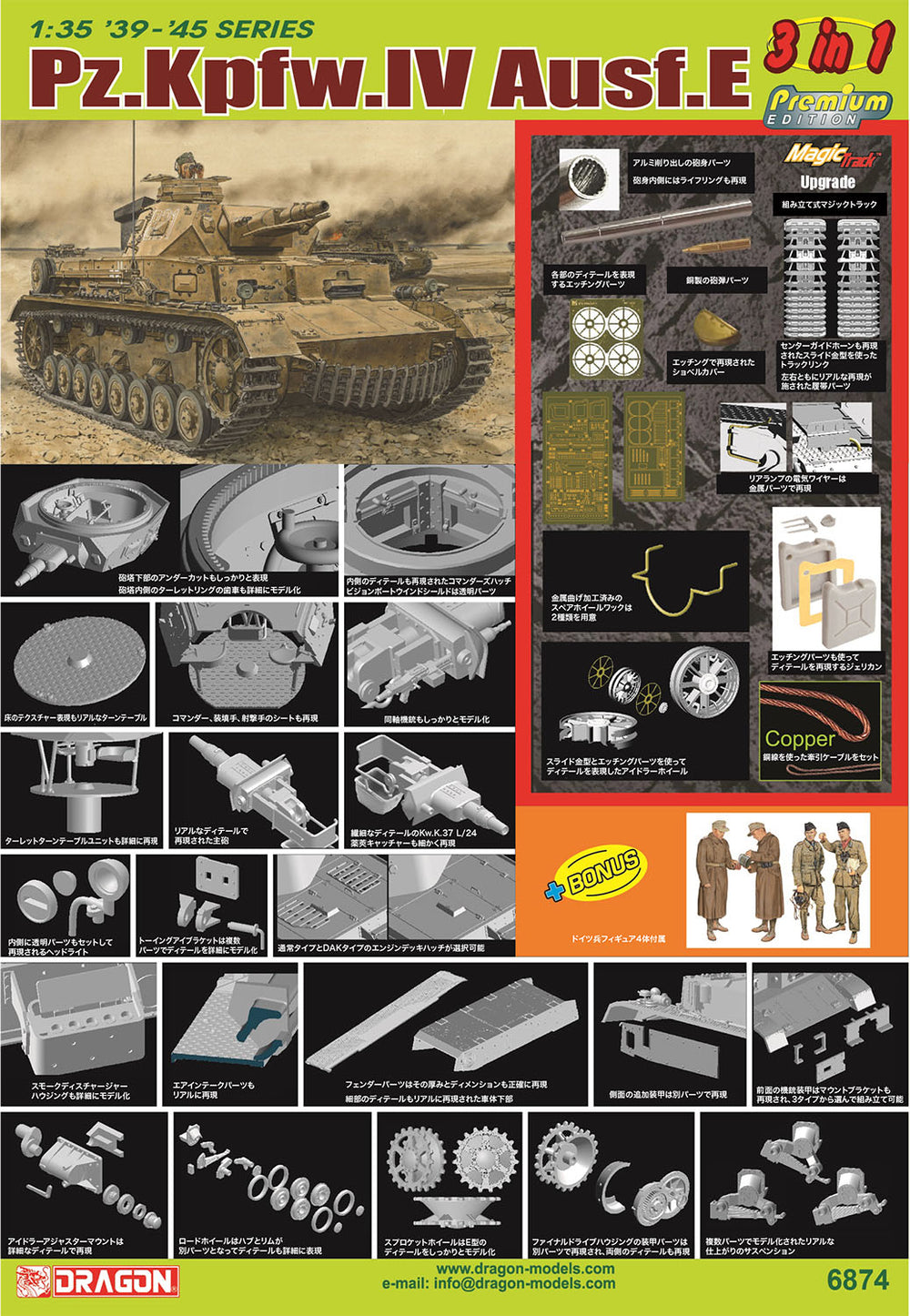 ●E型の初期型、後期型、DAK仕様を選んで組み立てられる3in1キット●D型に続くIV号戦車の改良型、E型を豪華仕様で作る