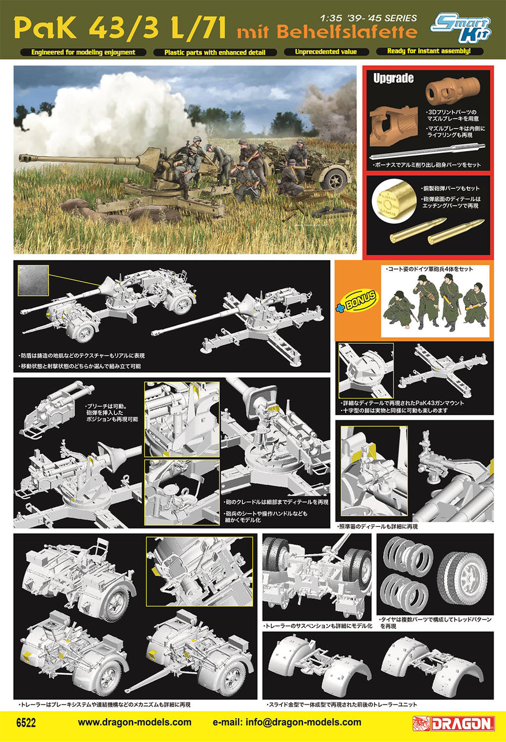 モデルは第二次大戦でドイツ軍が開発、運用した最強の対戦車砲のひとつ、88mm対戦車砲Pak43を1/35スケールで再現したプラスチックモデル組み立てキットです。中でもヤークトパンター用として予定されていたPak43/3L/71タイプを十字型の砲架とともにモデル化しています。加えてこのキットは砲身にアルミ削り出しパーツ、マズルブレーキには3Dプリントパーツを用意し、砲兵フィギュア4体もセットした豪華仕様です。砲のメカニズムやディテールは詳細に再現。砲身にはアルミ削り出しパーツをセットし、マズルブレーキは3Dプリントパーツで内側のライフリングも再現して仕上がりのリアリティを高めます。ヤークトパンターそのままの防盾もモデル化され、独特な雰囲気が楽しみ。さらに、砲架は十字型の形状はもちろん、実物同様に射撃姿勢、移動状態に可動。輸送時に砲架を乗せるトレーラーパーツもセットされています。また、ロングコートを着用したドイツ軍砲兵4体もセット。砲撃準備のポージングは情景シーンの再現が楽しみです。銅製の砲弾パーツも用意されフィギュアとの組み合わせでリアルな情景を演出します。-