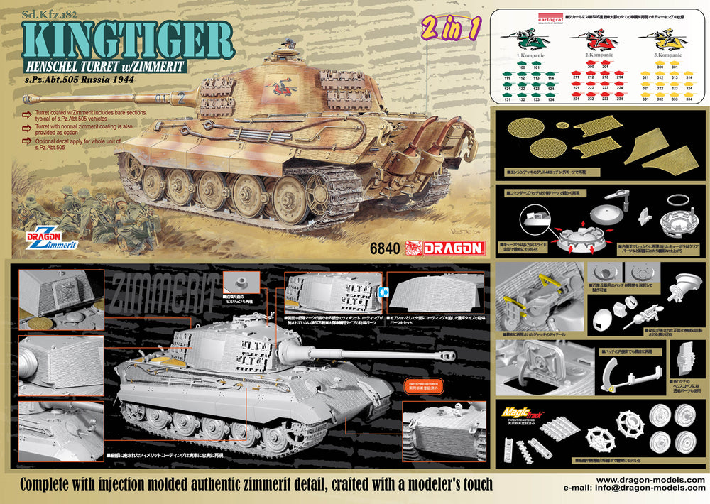 中でも1944年9月に45両のキングタイガーを装備したドイツ国防軍第505重戦車大隊の車両をフィーチャー。デカールは砲塔側面に描かれた部隊マーク、馬に乗る騎士のマークとすべての車両の車両番号を再現できるマークを収録。