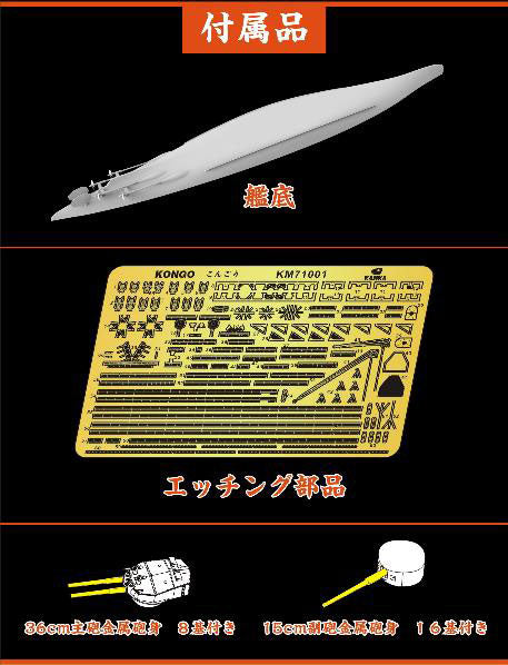 • キット内容は「1/700 日本海軍 超弩級巡洋戦艦 金剛 1914年」、「1/700 日本海軍 超弩級巡洋戦艦 金剛 1914年 フォトエッチング」、「1/700 日本海軍 超弩級巡洋戦艦 金剛 36cm砲 金属砲身」、「1/700 日本海軍 超弩級巡洋戦艦 金剛 1914年 15cm砲 金属砲身」が同梱されている他、艦底パーツ付属でフルハル仕様になります。