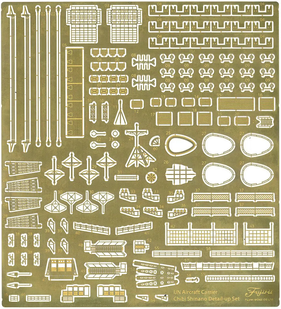 エッチングパーツは手摺、窓枠、ラッタル、梯子、クレーン、煙突回り、雨水カバー、整風板、一三号電探、二一号電探、銃座の防楯、照準器、転落防止ネット、舷梯、遮風柵、着艦標識灯、制動装置、着艦装置、噴進砲、菊花紋章、艦橋部などを収録。-