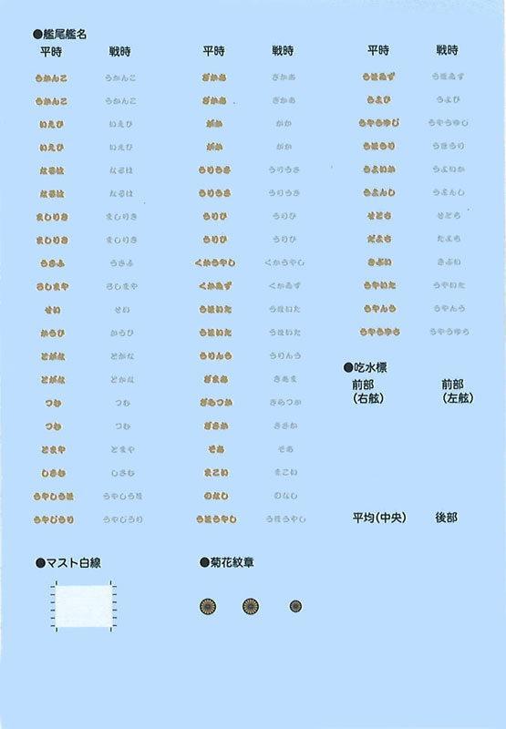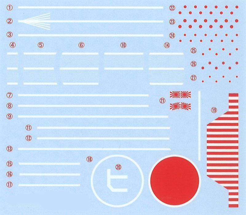 □デカールは3種類で艦載機のマーキング用1枚、艦尾艦名や甲板支柱の白線用2枚、飛行甲板マーキングや軍艦旗、昭和17年6月のMI作戦時に於ける飛行甲板/味方識別マーク(日の丸)を収録した飛龍専用が1枚付属。