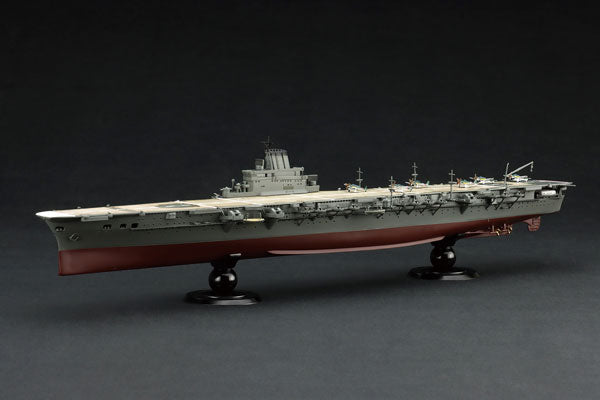 エッチングパーツには、エレベーター、滑走制止装置、着艦制動装置などを収録。- 製品は艦底まで再現できるフルハル仕様で、完成後に飾って楽しめる台座が付属します。