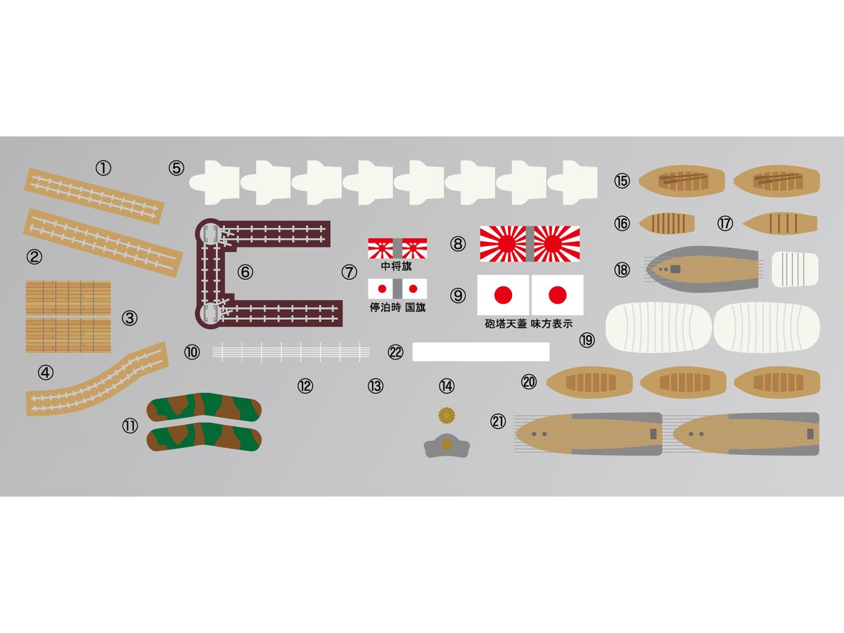 シールにはサービス収録として、ミッドウェイ海戦時の砲塔上対空識別日の丸、中将旗なども含みます(切り込みはありません)インジェクションパーツでは再現の難しい、細部に至るまで表現できるエッチングパーツを封入。