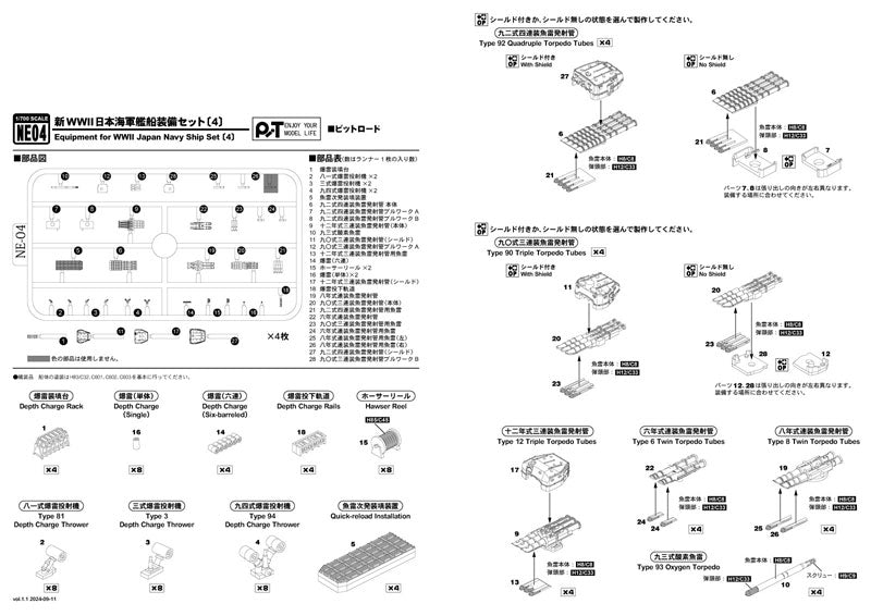 • 【セット内容】 九二式四連装魚雷発射管×4、九〇式三連装魚雷発射管×4、十二年式三連装魚雷発射管×4、八年式連装魚雷発射管×4、六年式連装魚雷発射管×4、魚雷次発装填装置×4、九三式酸素魚雷×4、爆雷投下軌道×4、爆雷装填台×4、爆雷(単体×8、6連×4)、九四式爆雷投射機×8、三式爆雷投射機×8、八一式爆雷投射機×8、ホーサーリール×8