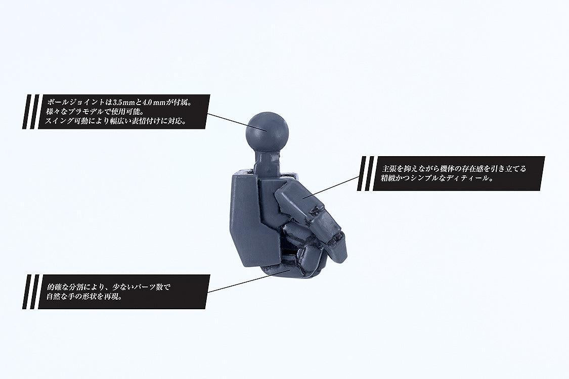 ・手首の接続用ボールジョイントは「3.5mm」「4.0mm」2種からの選択式となっており、様々なプラモデルと組み合わせることでカスタマイズの幅が広がります。-
