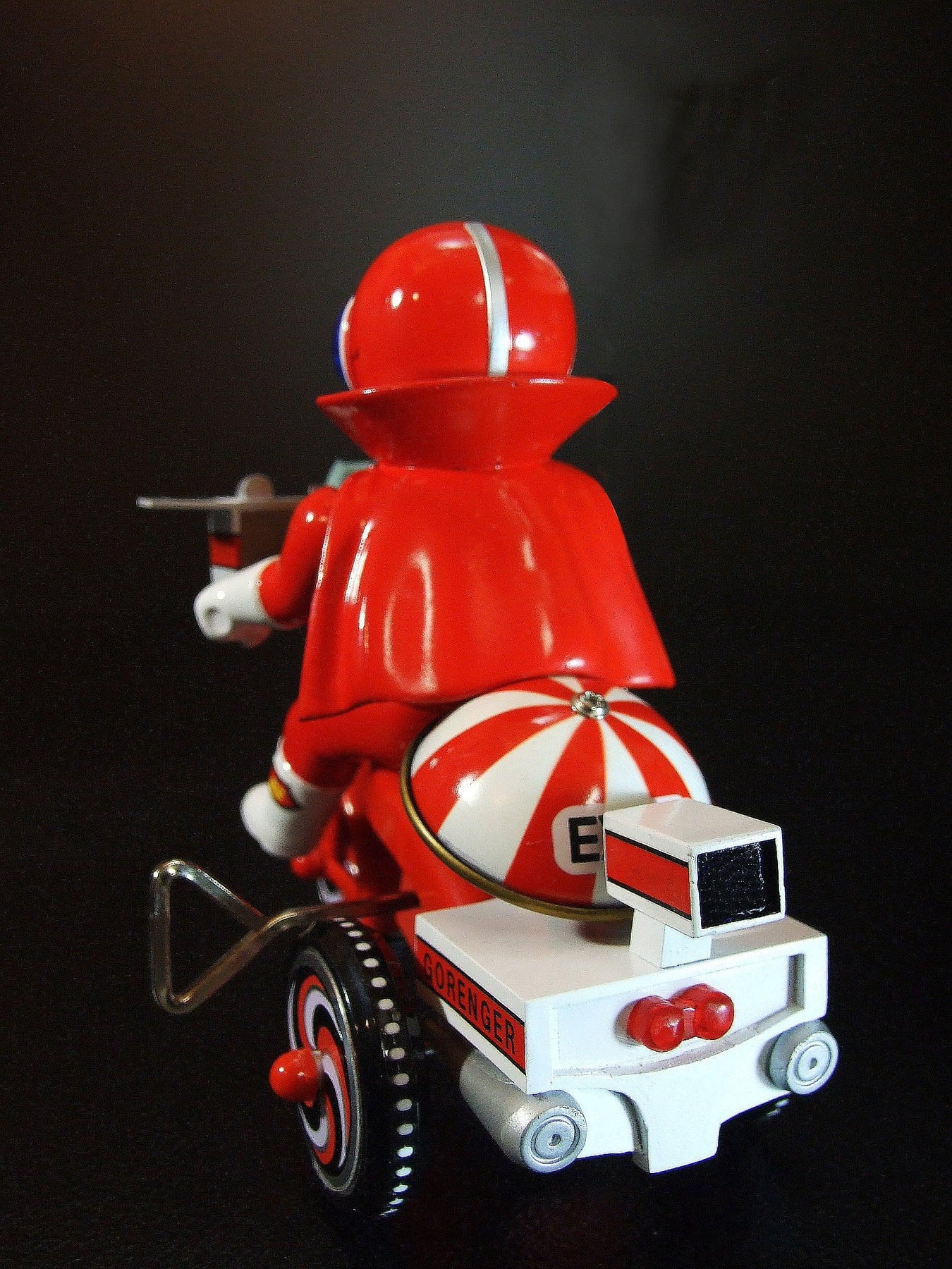 「秘密戦隊ゴレンジャー」に登場するキャラクターたちが、懐かしくレトロなゼンマイ式三輪車に乗ったソフビフィギュアで登場!!