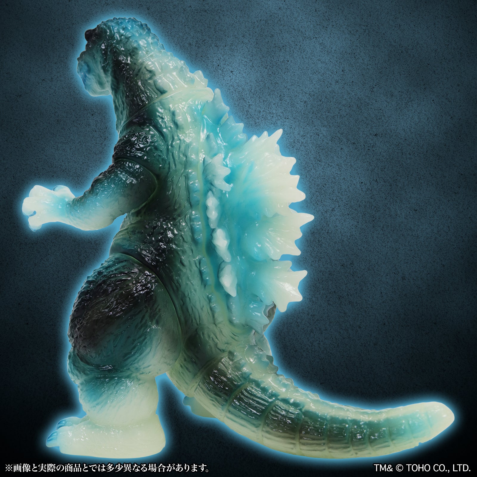 暗闇で光る蓄光素材のソフビに、放射熱線の発光をイメージしたブルーを基調とする鮮やかなカラーリングで彩色。
