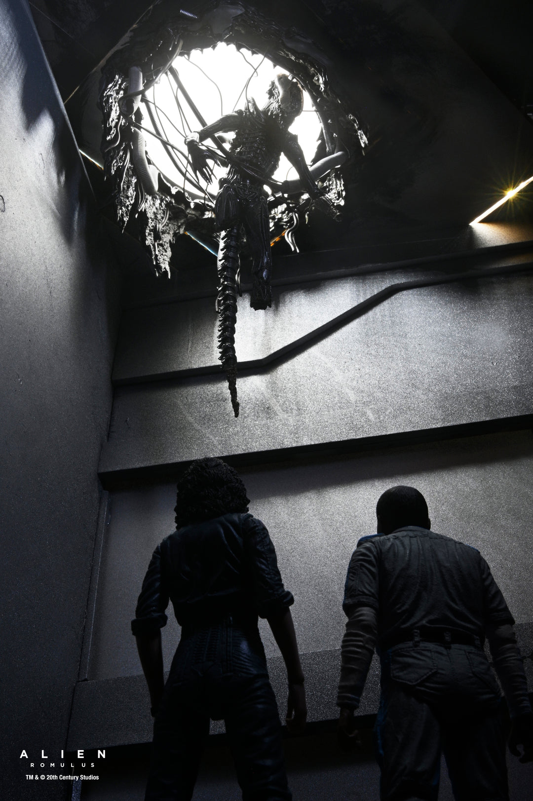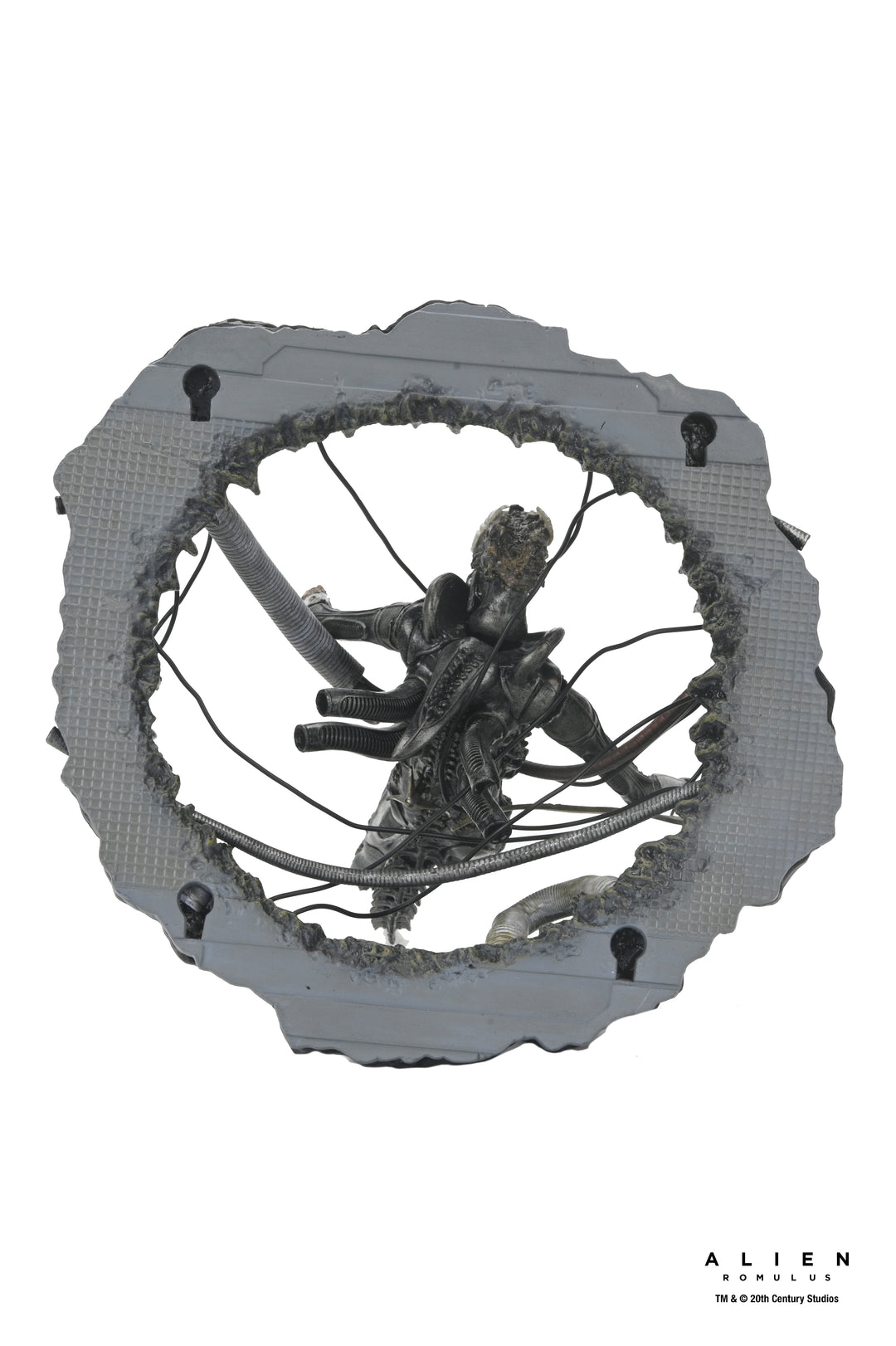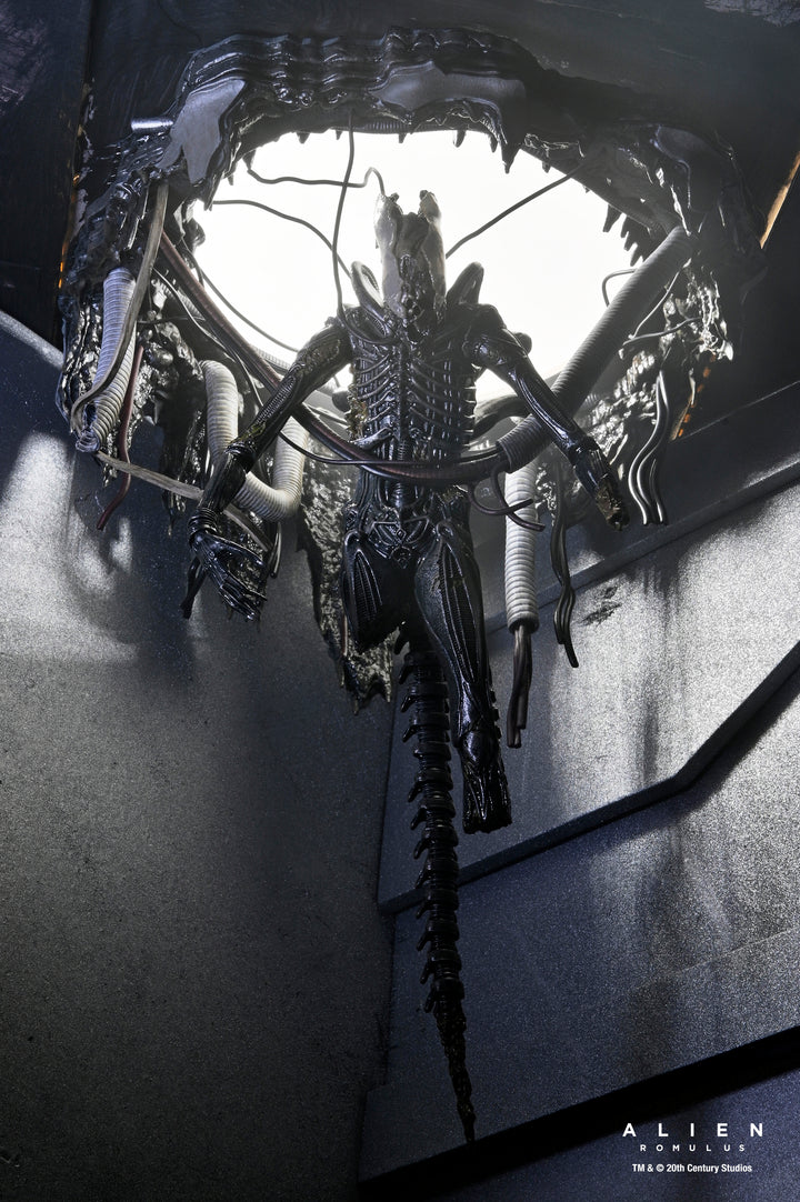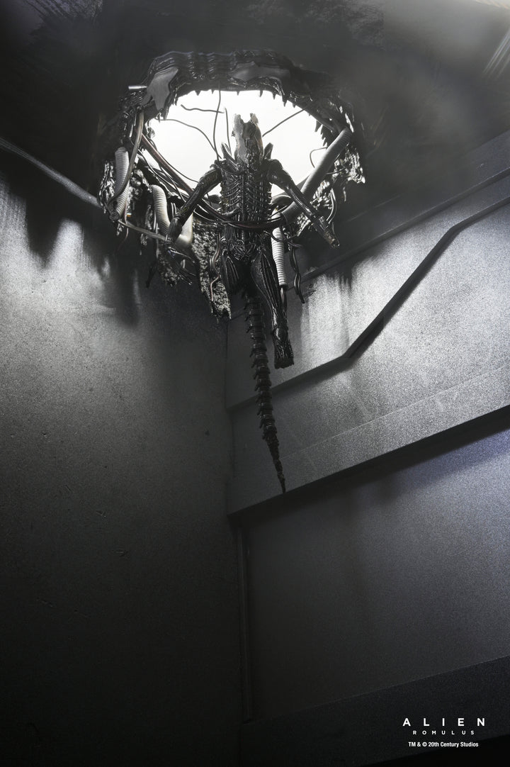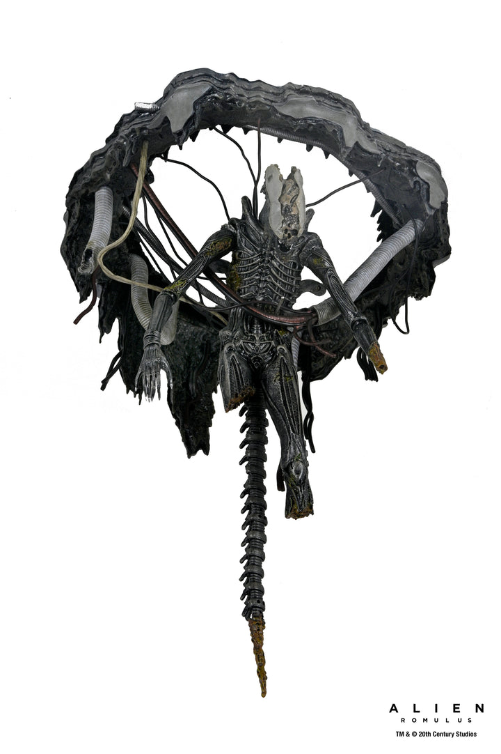 劇中でインパクトを与えたロムルス号に吊るされた、ノストロモ号の惨劇に陥れた実験体「ゼノモーフXX121」がまさかの7インチフィギュアとして登場。壁や天井から吊り下げる事が可能なエイリアンの血液(酸)で溶かされた天井パーツも付属した、DXの名に相応しいファン待望のアイテムとなりました。-