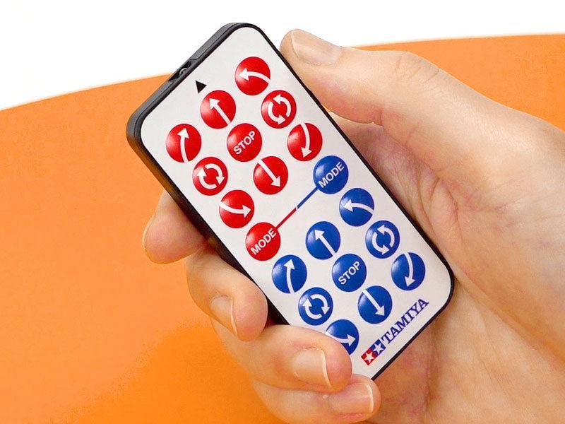 リモコンで左右のモーターの動きを制御して、前後進や左右旋回、その場で回転が可能です。
