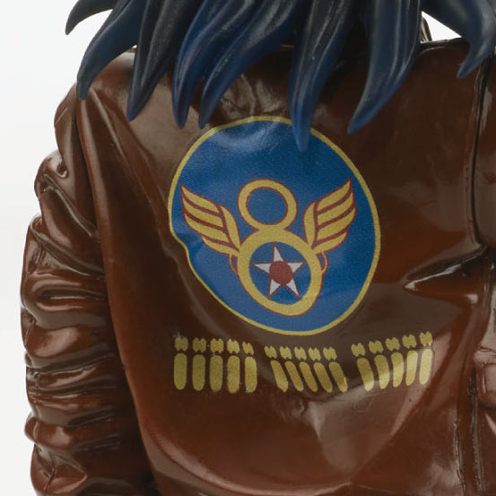 アメリカ陸軍航空隊用に製作されたA2レザージャケットと将校略帽を着用。