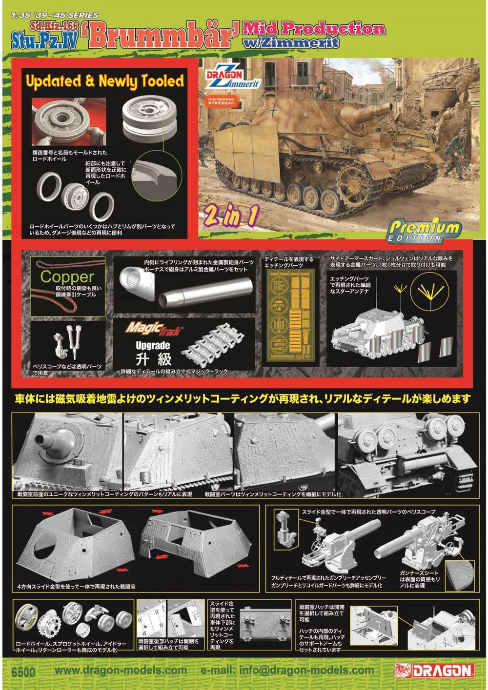 モデルはIV号突撃戦車ブルムベアの初期生産型を1/35スケールで再現。このキットはリアルな仕上がりの組み立て式履帯、マジックトラックをセットする他、砲身、シュルツェンには金属パーツが用意され、車体にはツィメリットコーティングを表現した豪華仕様です。ロードホイールのディテールを正確に表現したパーツも用意。実感あふれる足回りを再現します。車体上部の背の高い独特な形状の戦闘室は4方向スライド金型を使って一体でその形状を正確に再現。戦闘室ルーフは別パーツで細かなディテールもしっかりとモデル化。ハッチは開閉を選択して組み立て可能です。ハッチから見える戦闘室内部の主砲は砲架を含めてフルディテールで再現。メカニカルな仕上がりを約束します。また、車体に施されたツィンメリットコーティングも表現され、繊細なディテ^るを味わっていただけます。金属パーツが用意されたシュルツェンは初期型タイプをしっかりとモデル化。分割して取り付けも可能です。-