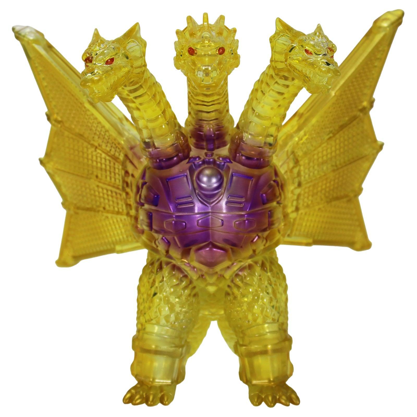 金色の輝きの中から姿を現すメカキングギドラを、クリアソフビにクリアイエロー・ゴールド、中央にはパープルのグラデーションを彩色して鮮やかに表現しています。