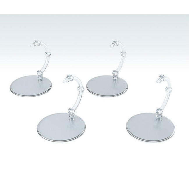10cm前後のちいさいフィギュアに最適!透明ディスプレイスタンド4個セット。ねんどろいどにも対応!10cm前後の小型フィギュア、デフォルメフィギュアのディスプレイに最適。シンプルなデザインの透明プラスチック製ディスプレイスタンドです。支柱の先端は直径3mmの接続ピンで、同径の接続穴に取り付けできます。挟み込むクリップ型の固定パーツと、ねんどろいどに対応した(※)六角ピンも付属します。ABS樹脂製。透明素材。ベース部直径約6cm。支柱は、曲線タイプと直線タイプの2種が付属します。支柱(曲線タイプ)高さ3~7cm。支柱(直線タイプ)高さ4.5~10.7cm。