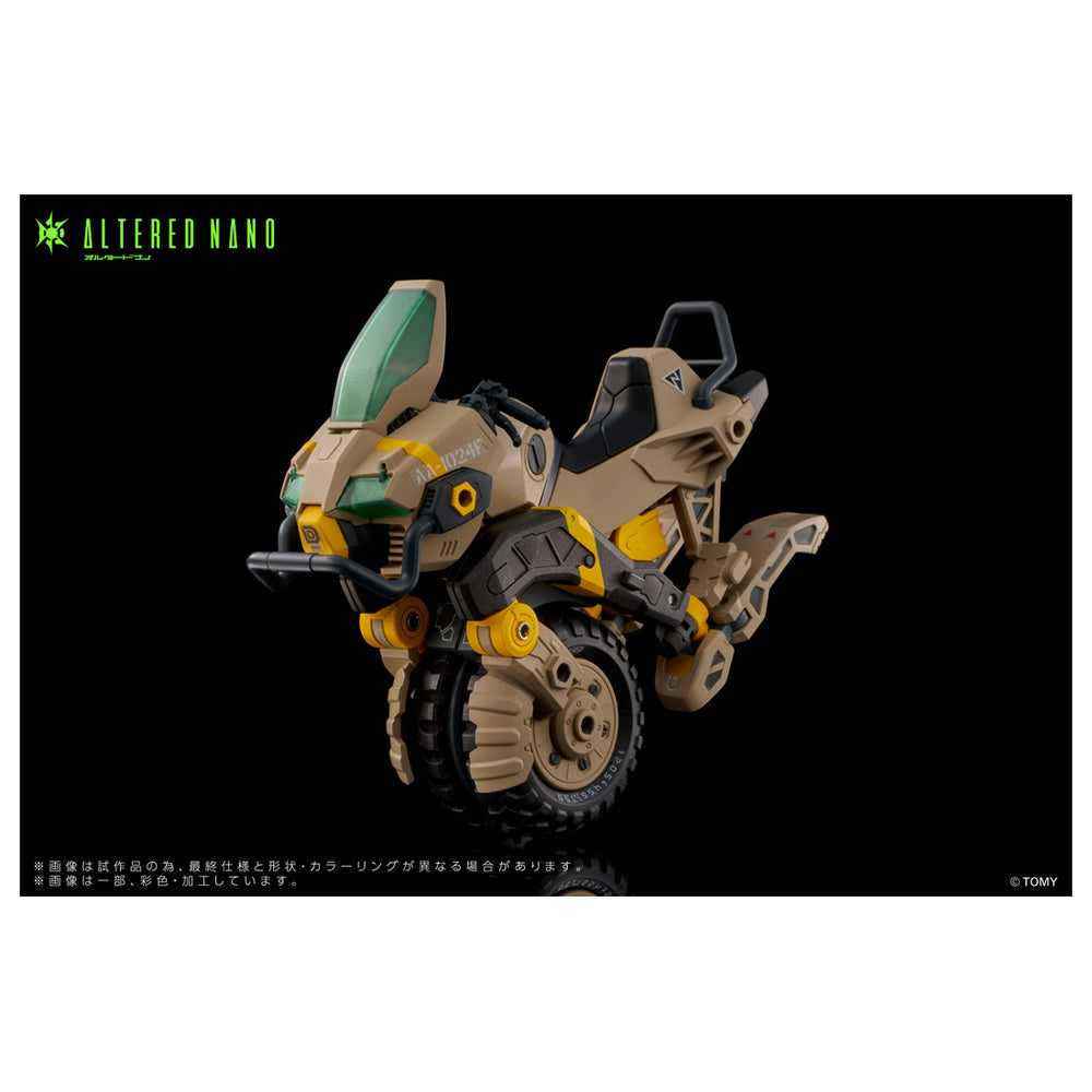 - 完成品アクションフィギュアシリーズ「オルタードナノ」 フィギュアデザインを新川洋司氏、メカニックデザインを荒牧伸志氏が手掛ける、全高約10cmに凝縮されたフィギュアとメカニズムの連動により、新たな遊びが発現する。 荒牧伸志氏がデザインを手掛けるオルタードナノの連動メカ第一弾。 単輪のビークルシフトから二足歩行のコンバットシフトへと移行可能。 また、別売りの「AN-01 Alt FRIGATE<フリゲート>」を搭乗状態のままコンバットシフトへ移行可能。 ビークルシフトではハンドルが可動、タイヤが回転可能。コンバットシフトでは加えて脚部・ウィンドシールド・カウルが可動。 各部には3mmジョイントが配置され、武器の位置などのカスタマイズやディスプレイが可能。 待機状態で展示可能なスタンドパーツと武器、交換可能な武器マガジンパーツ3つ、マガジンホルダーパーツが付属。 電池は使用しません。 NO BATTERIES REQUIRED