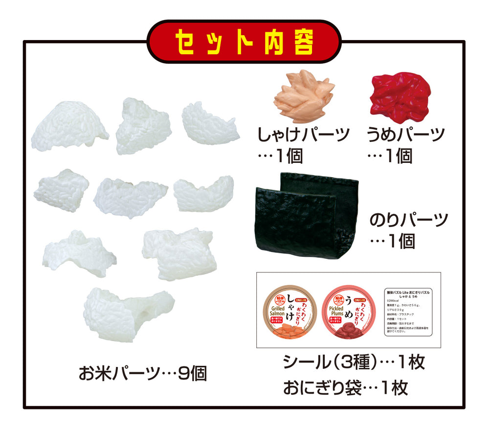 • 9個のお米パーツを正しく組み合わせるとおにぎりが完成するパズルです。