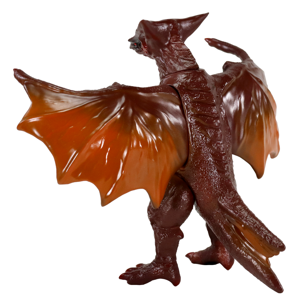 翼を広げたギャオスの姿を、手のひらサイズのレトロソフビへと落とし込んだ造形に、ギャオスのボディをイメージした茶色の成形をベースに、オレンジ・ブラック・レッドを各ポイントに彩色。
