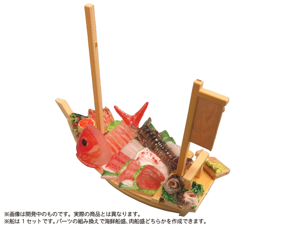 フィギュアのごはんシリーズ!第8弾。豪華な船盛をテーマに、海鮮船盛、肉船盛をパーツの組み換えで作成できます。