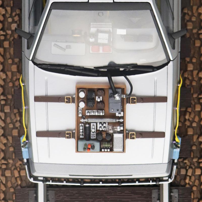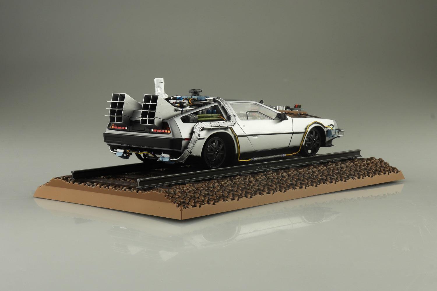大ヒットSF映画『バック・トゥ・ザ・フューチャー パートⅢ』で、1885年から1985年に戻るためにタイムスリップの条件である約142km/hを出すため、線路の上を走れるよう足回りが改造されたタイムマシンを1/24スケールのプラモデルで再現。