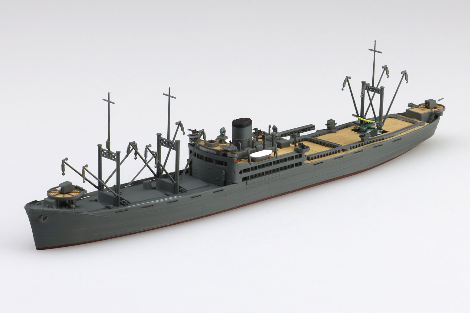 川崎汽船の貨物船として建造された本船は太平洋戦争中の1942年に特設水上機母艦としての艤装を施されました。輸送任務中、米潜水艦から2度の雷撃を受けるも不発となり生還しましたが、1945年5月爆撃により沈没しました。本キットは特設水上機母艦に改装された「國川丸」を1/700スケールのプラスチックモデルキット化。要点を抑えたパーツ構成で、シンプルで組み立て易く、かつ的確に再現できます。25mm連装機銃や航空機用カタパルトなど各種艤装を新設計で追加しました。1/700スケールの精密感や緻密さをうまく表現しています。