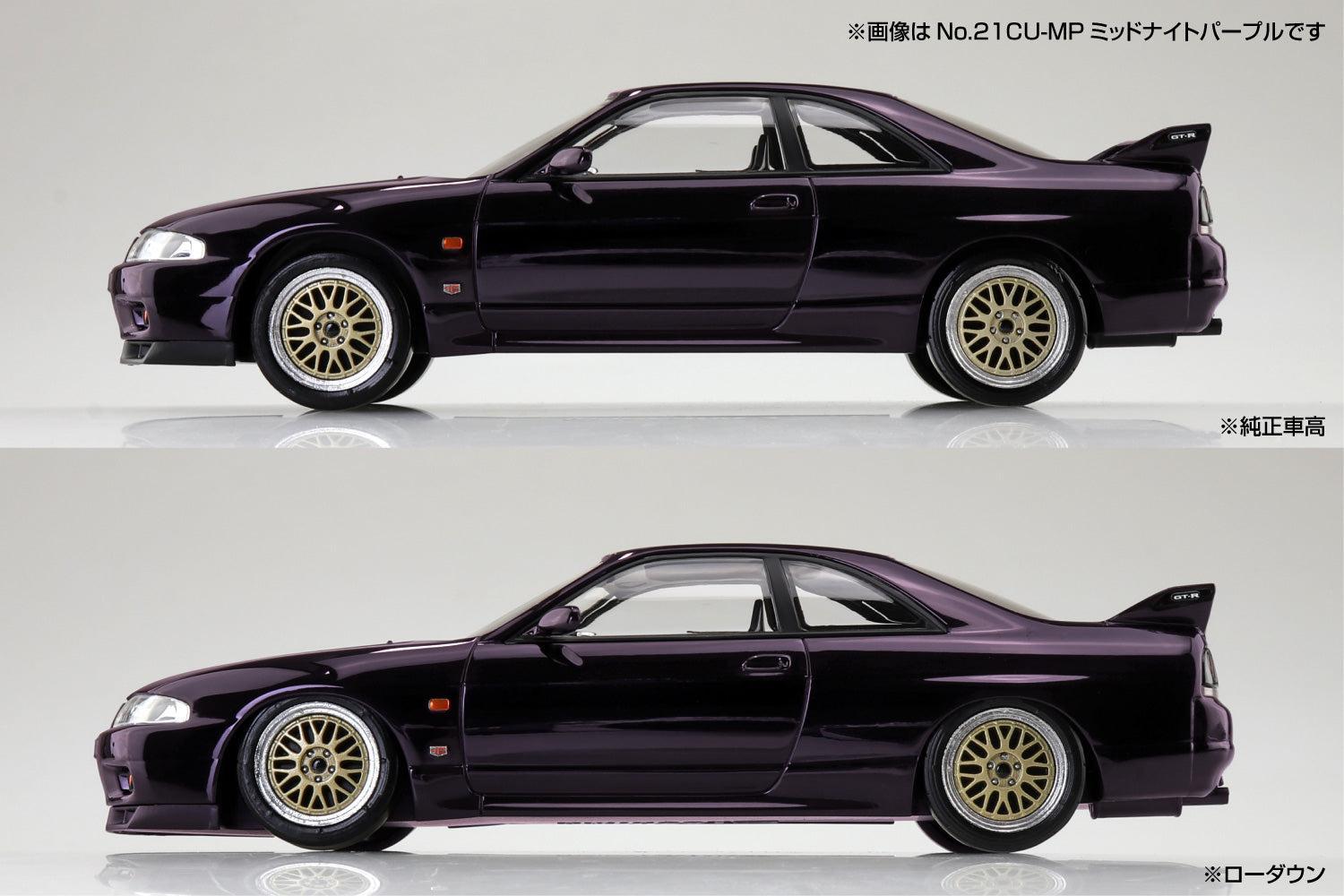 R33型 GT-Rにボディ色ごとに付属のホイールカラーが異なるカスタムホイール仕様が追加。選択式でローダウン仕様も組み立て可能。18インチ設定のカスタムホイールとカスタムタイヤ仕様で、R32型・R33型・R34型と集めれば組換え遊びが可能。自由な発想で楽しもう。