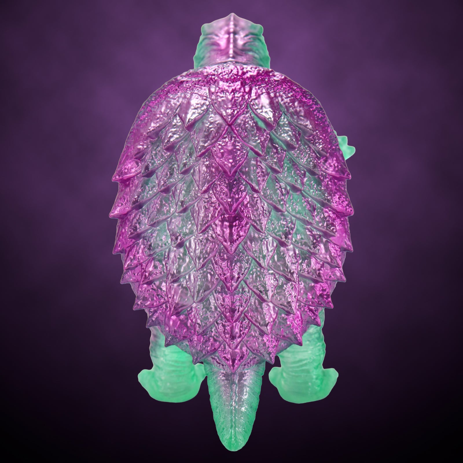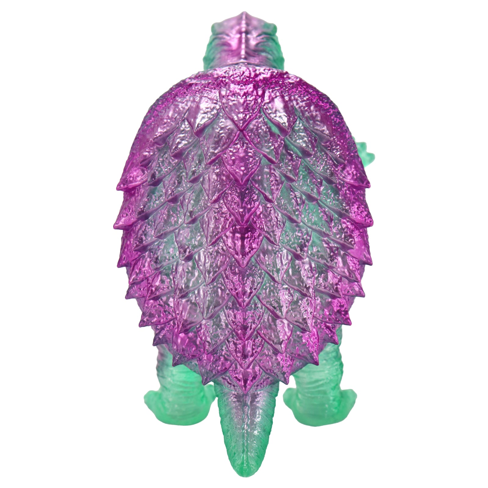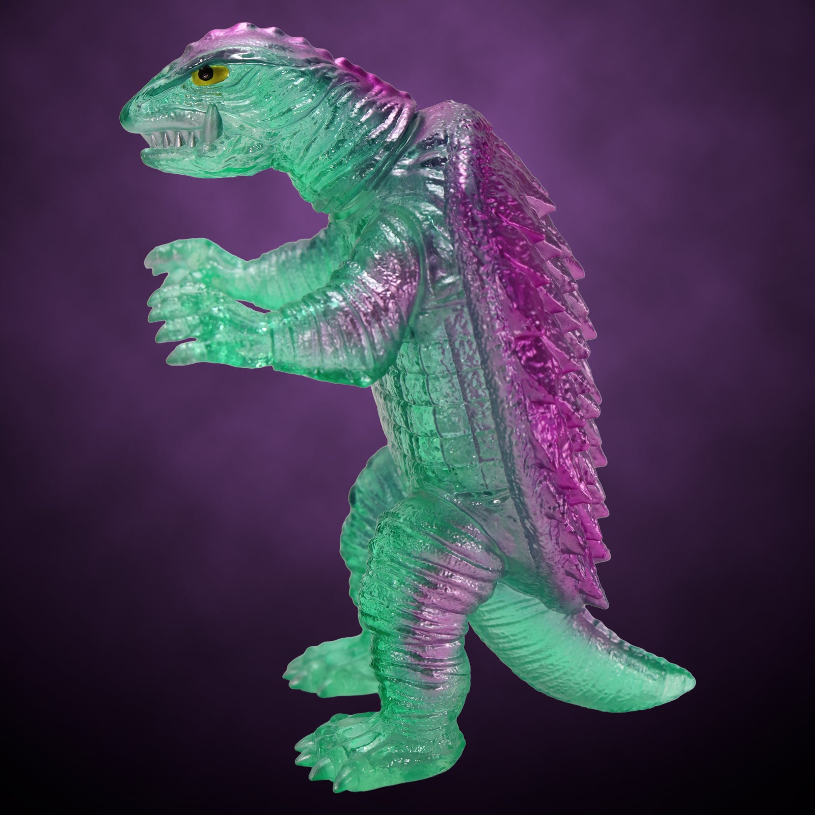 昭和ガメラの特徴を捉えた顔・手足の造型や、折り重なった甲羅のディテールなど見ごたえのある造型に、「レトログリーンクリアVer.」では日本国内成型による美しいクリア成型に、クリアグリーン・メタリックピンクによる鮮やかかつレトロ感溢れる彩色が施されています。