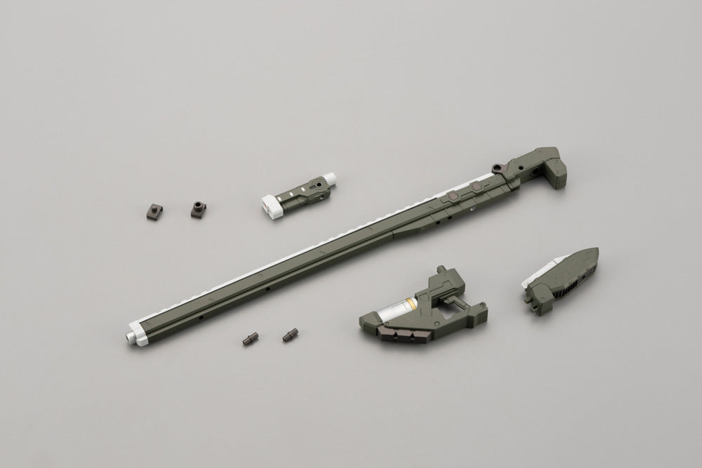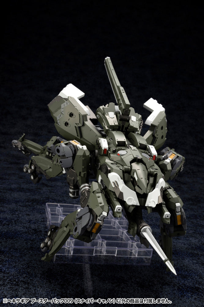 ブースターパック第9弾はヘキサギア史上最長となる約320mmの大型キャノンユニットです。成型色はシリーズ内で共通カラーの多いヘキサギアダークグリーンとなっており、ブースターパック007から010を使用する事で大型砲戦ヘキサギア「ブロッケード・アイビー」のダークグリーン仕様を組み立てる事が出来ます。