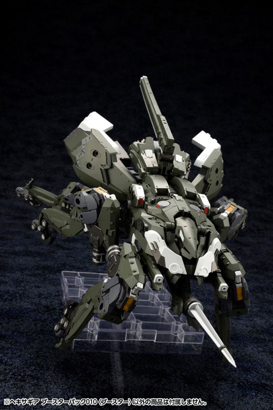 ブースターパック第10弾は多数のユニットで構成された大型の複合ブースターです。成型色はシリーズ内で共通カラーの多いヘキサギアダークグリーンとなっており、ブースターパック007から010を使用する事で大型砲戦ヘキサギア「ブロッケード・アイビー」のダークグリーン仕様を組み立てる事が出来ます。