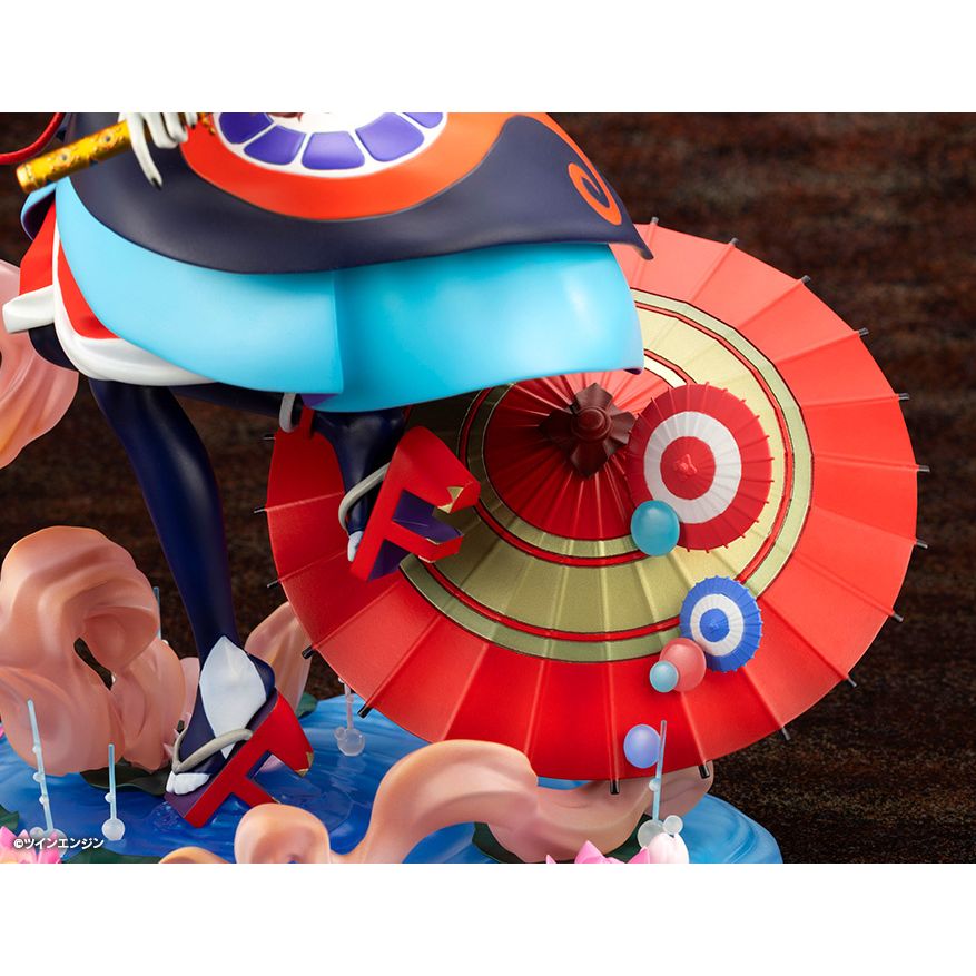 それぞれ細部にまでこだわり造形されています。水をモチーフとした台座には、作中に描かれた蓮の花や雲、唐傘や雨をイメージしたエフェクトが配置され、