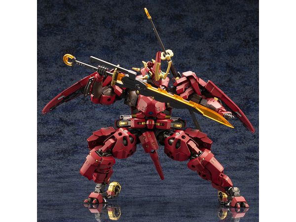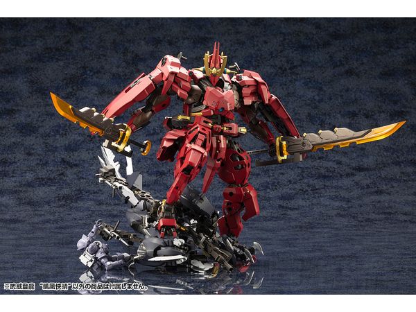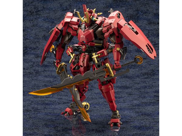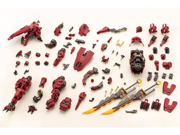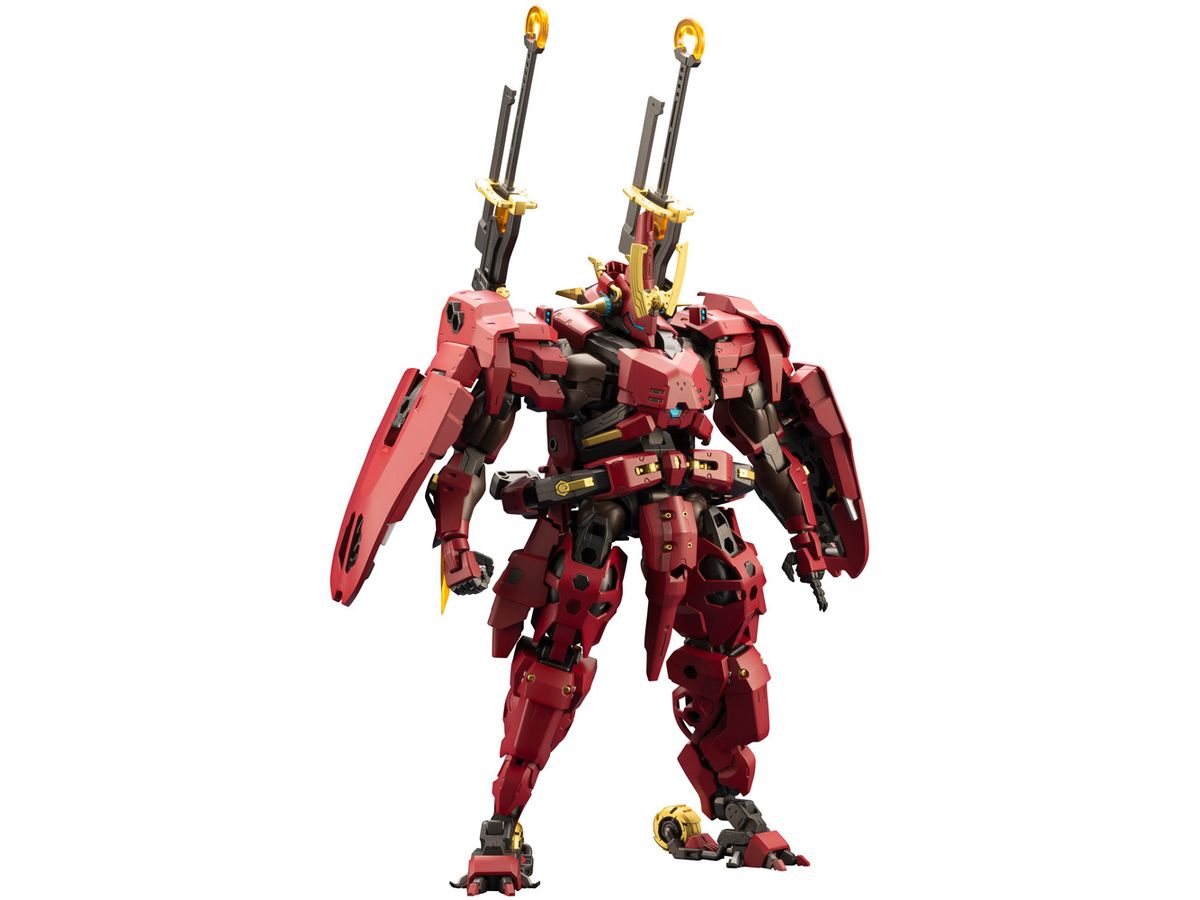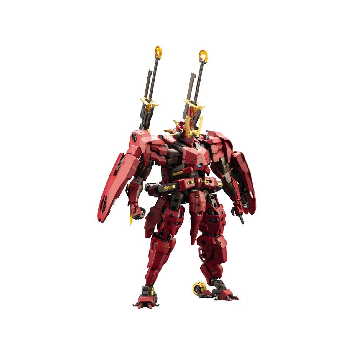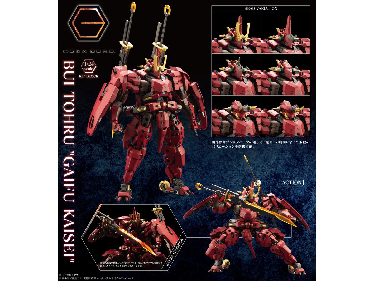 高い保持力を持つ六角形のジョイント「ヘキサグラムシステム」によって独自のメカへの組み換えを楽しむ事が出来るキットブロックシリーズ「ヘキサギア」。シリーズ屈指の人気を誇る人型ヘキサギア「ブイトール」にまさかの“鎧武者”タイプが登場。二振りの”撃発式超大型戦術刀”を引っ提げた深紅の武者が、機械の獣達が跋扈する戦場を駆け抜ける!