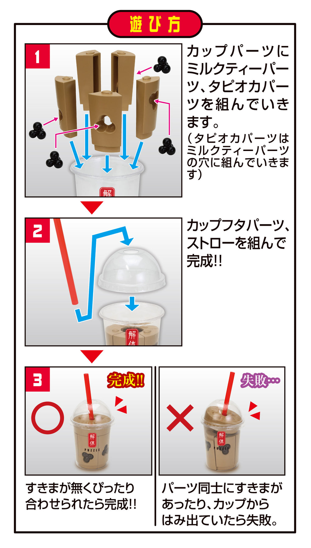 • カップに、6個のミルクティーパーツと4個のタピオカパーツを入れ、正しく組み合わせるとタピオカミルクティーが完成するパズルです。
