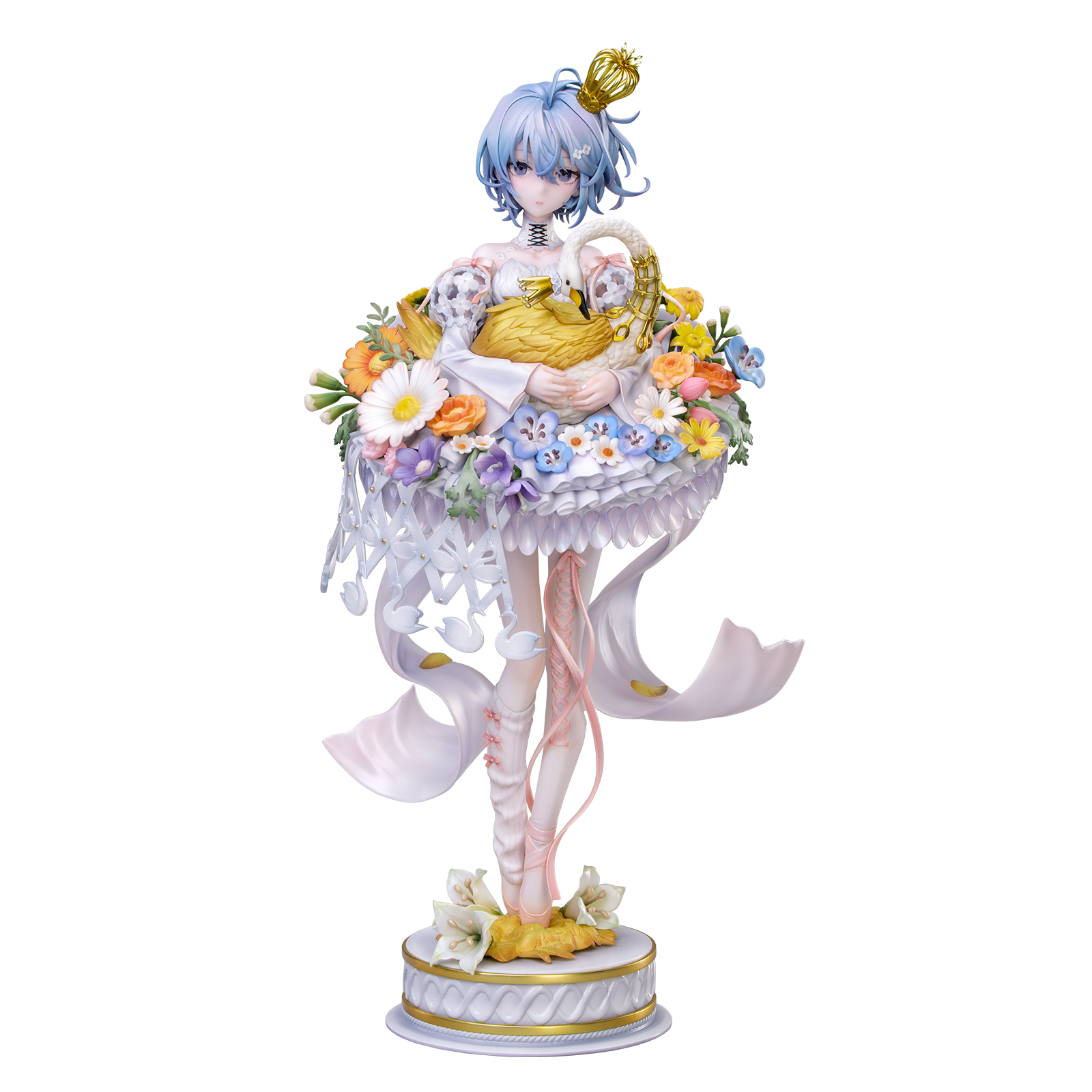 メタリック塗装が施された華やかな冠はきらめきを放ち、手のひらにそっと抱えた金色の白鳥は、スカート脇の透かし造形と白鳥モチーフのチャームと美しく呼応。風に揺れるブルーの髪にはやわらかなパールの艶が宿り、背中から垂れる半透明の純白リボンは、白鳥の首元を思わせる優雅な曲線を描きます。