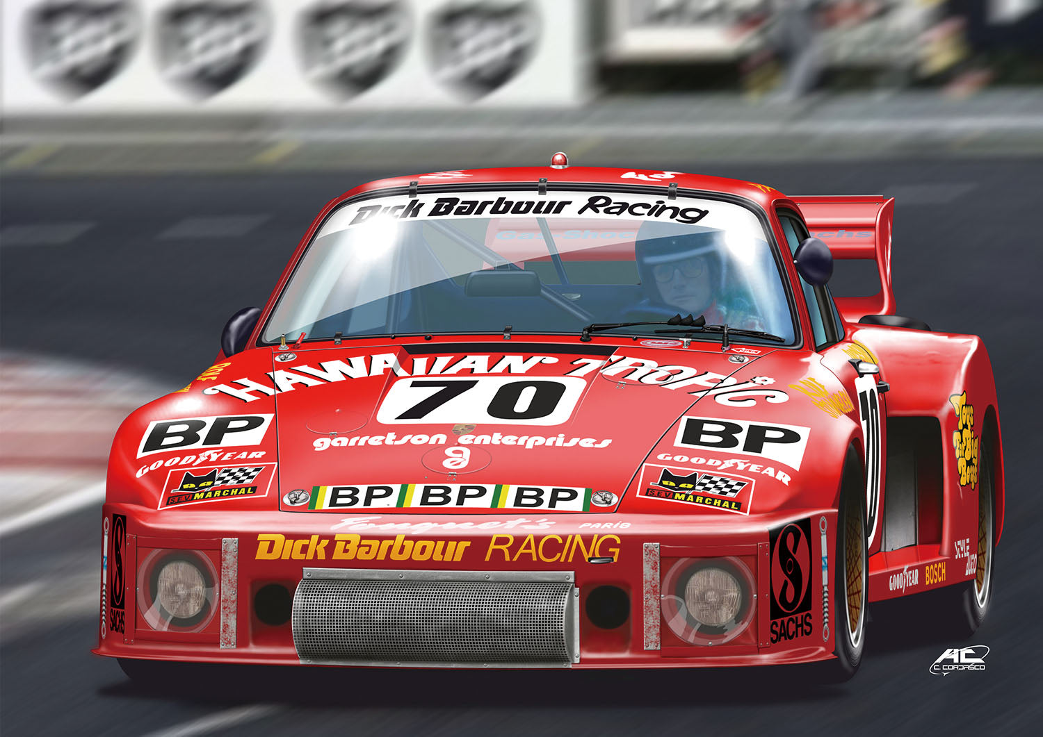 1976年から施行されたグループ5規定で争われることになった世界メーカー選手権用にポルシェが開発したのがポルシェ935ターボでした。ベースとなったのは市販ターボ車として話題を集めたポルシェ911ターボでそのボディ形状を残しつつ、より幅広いフェンダーや大型のリアウイングなどを装着。エンジンはターボチャージャー1基を装備した2856cc水平対向6気筒空冷エンジンを搭載していました。1976年にデビューしてチャンピオンを獲得すると、その後も開発を続け、ライバルを圧倒する性能を発揮します。1977年からはワークスチーム以外のプライベートチーム用にもマシンを供給。ヨーロッパのみならず、アメリカのIMSAシリーズでもプライベートチームの手によって活躍を見せます。1979年のル・マン24時間レースでは、プライベーターの一つクレマー・レーシングが独自の改良を加えた935K3と呼ばれるマシンで見事総合優勝を飾り、アメリカのIMSAから参戦したディック・バーバーチームの935もそのクレマーと最後まで優勝を争い、総合2位、IMSAクラス1位に輝いてポルシェの底力を見せつけたのです。モデルについて