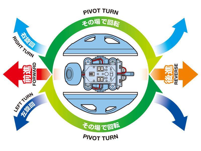 リモコンで左右のモーターの動きを制御して、前後進や左右旋回、その場で回転が可能です。