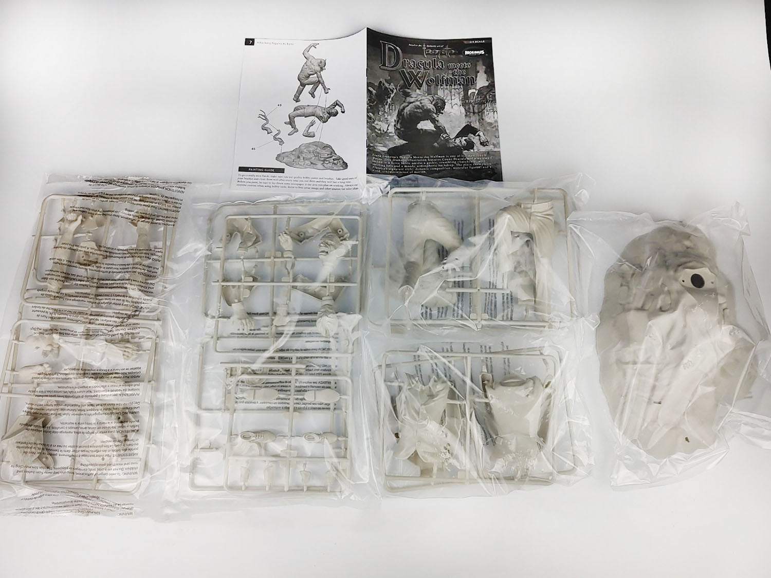 アメリカで人気のアーティスト、フランク・フラゼッタが1966年2月号のCreepy#7の表紙に描いたイラストをベースに1/8スケールで再現したドラキュラvs狼男のフィギュア組み立てキットです。