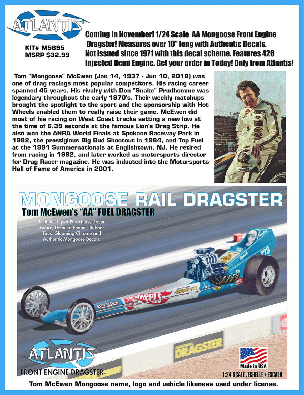 アメリカの人気モータースポーツ、ドラッグレースのドライバーとして活躍したのがトム・マキューエンです。全米ホットロッド協会、NHRAの全米選手権優勝も記録、NHRA最初の50年におけるもっとも重要なドライバー50人の一人にも選ばれています。1964年からは「マングース」のニックネームでライバルだった「ザ・スネイク」のニックネームで呼ばれたドン・プリュドムとのマッチレースで人気を集めたのです。また、1966年のホットロッドマガジンチャンピオンシップでの優勝をはじめ、1968年のスターダストナショナルオープン、1978年には全米ファニーカー選手権で優勝するなど、数々の勝利を飾ったほか1968年のオレンジカウンティPDAミーティングでは6.64秒という記録を樹立するなど、輝かしい戦績を残したのです。モデルについて