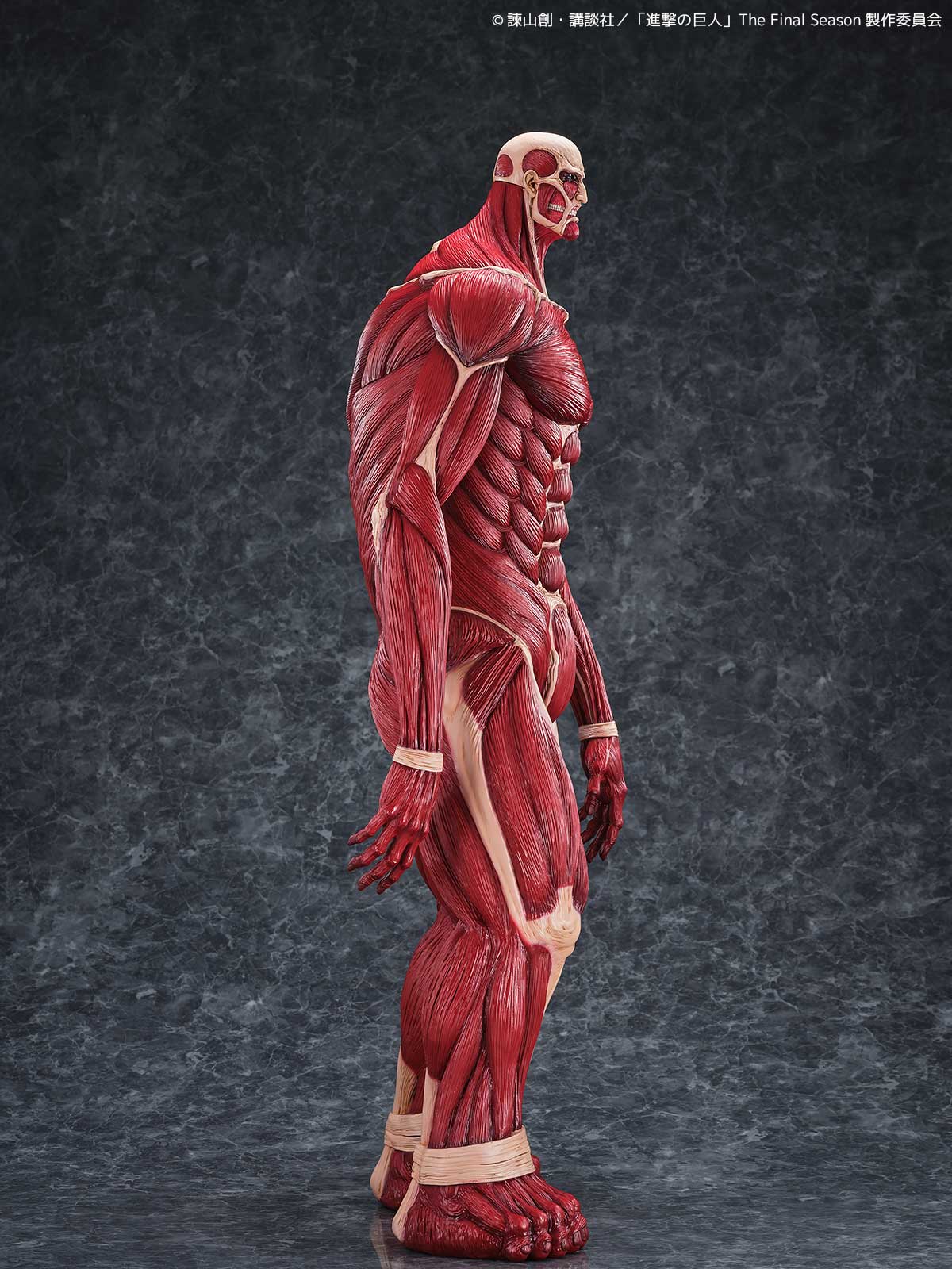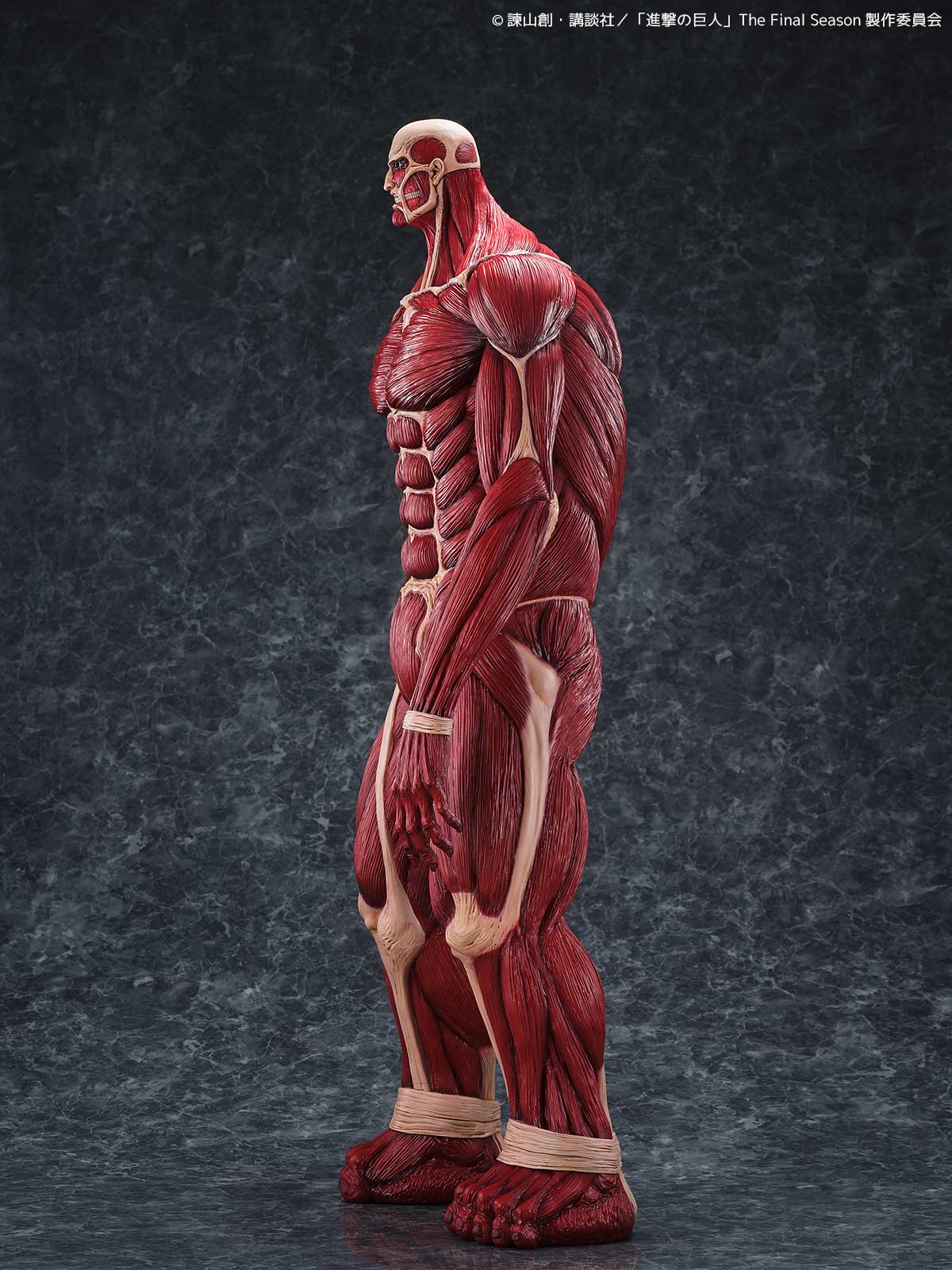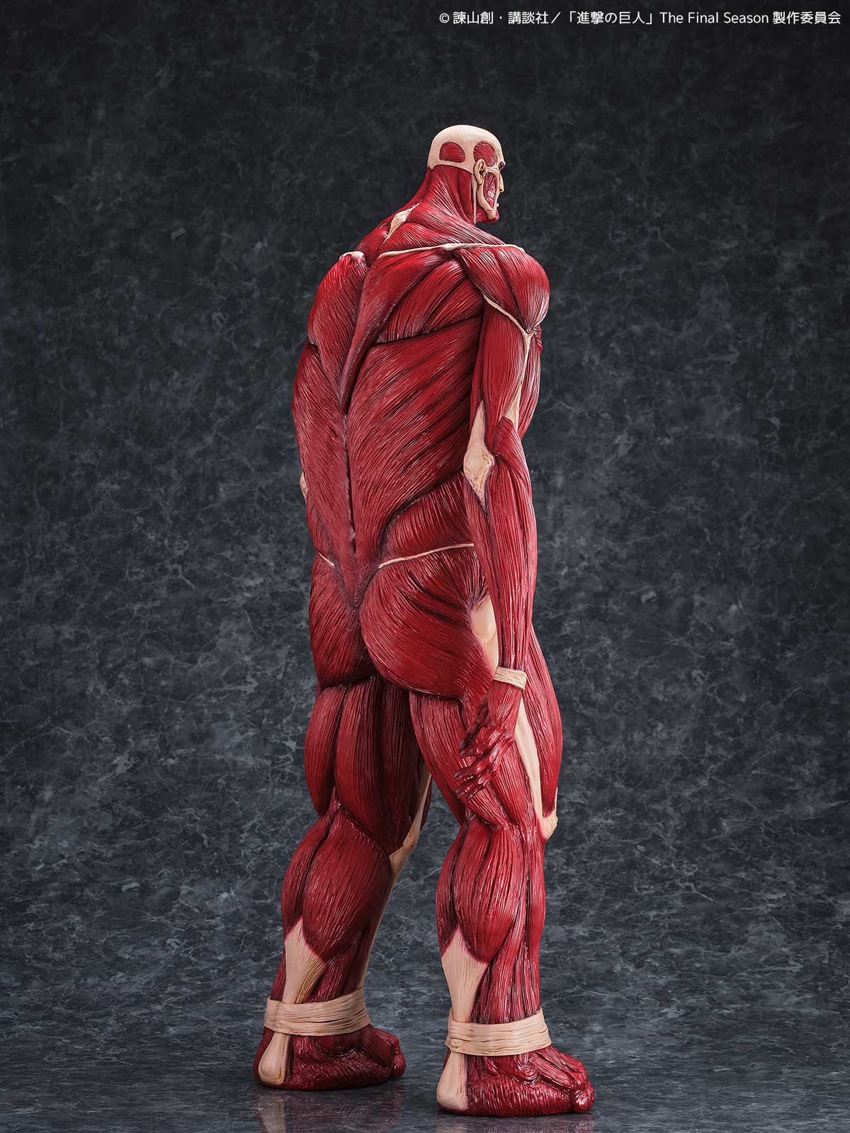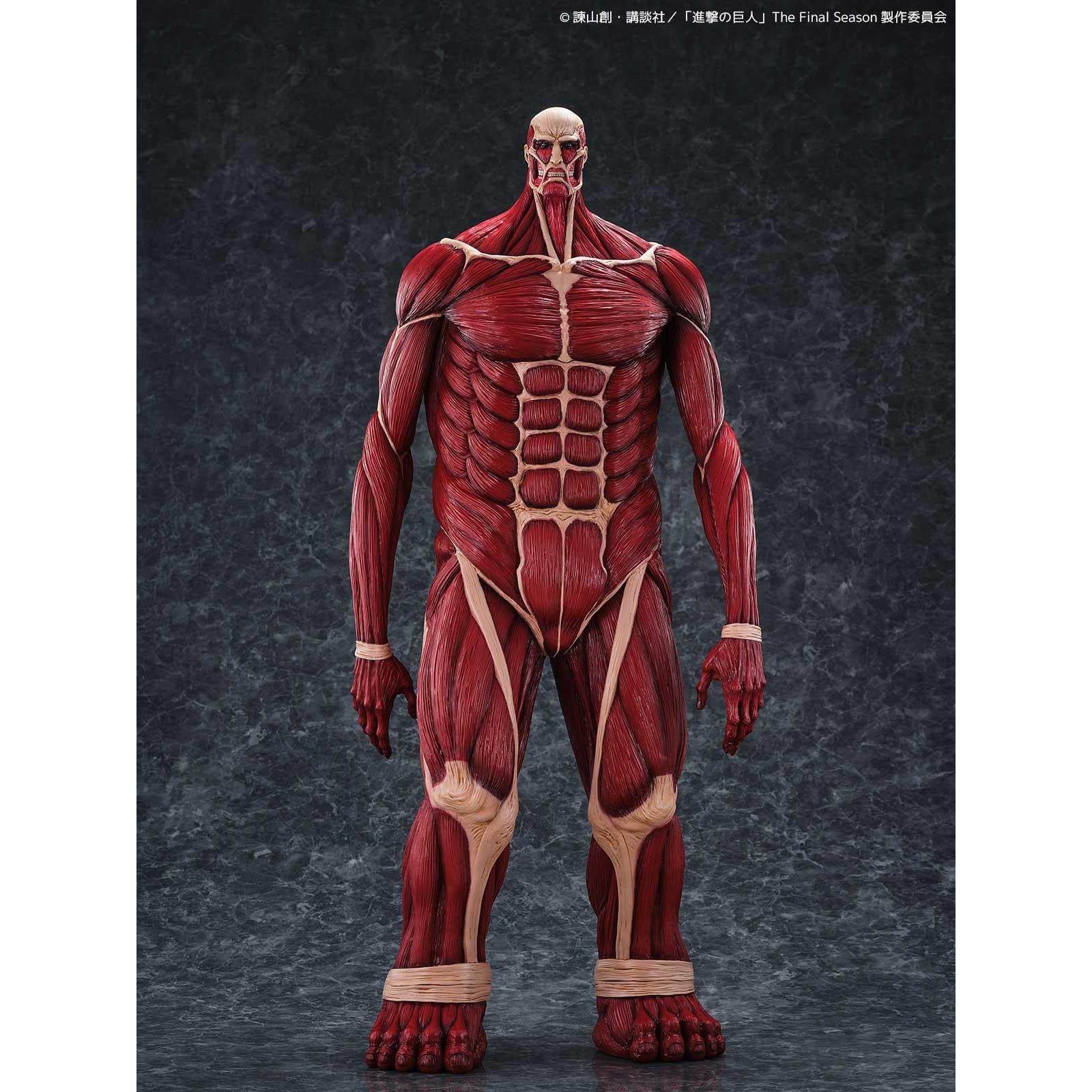 劇中では50メートルの壁の向こうからその姿を現した巨体を、全高63センチという圧巻のサイズで立体化。全身の筋繊維はこのスケールにふさわしい精密な造形で再現され、重厚な脚部、がっしりとした胴体、対照的に細身にも見える腕、見上げた際の遠近感を意識した小ぶりな頭部など、独特のプロポーションが「巨大さ」をより強調しています。