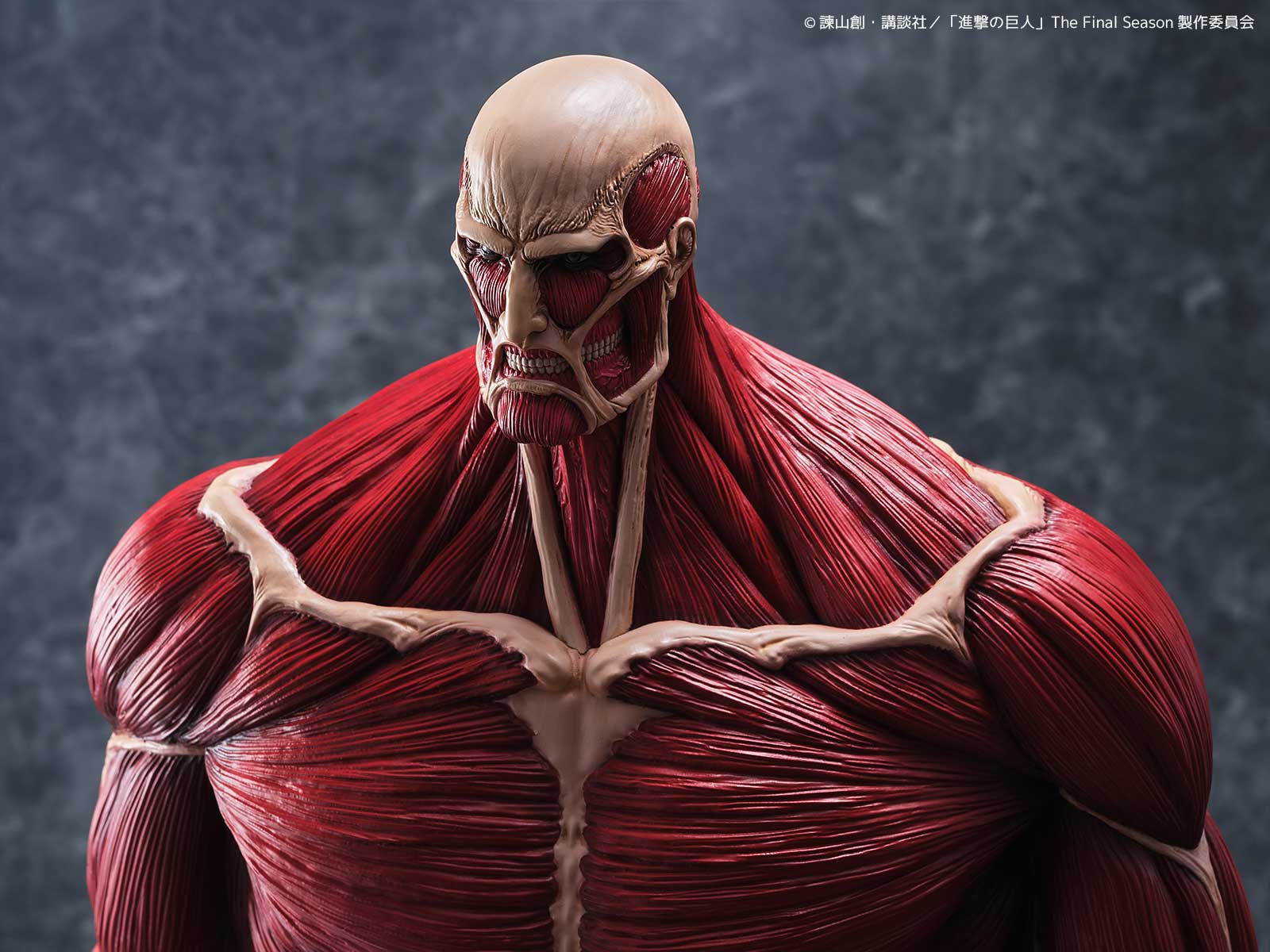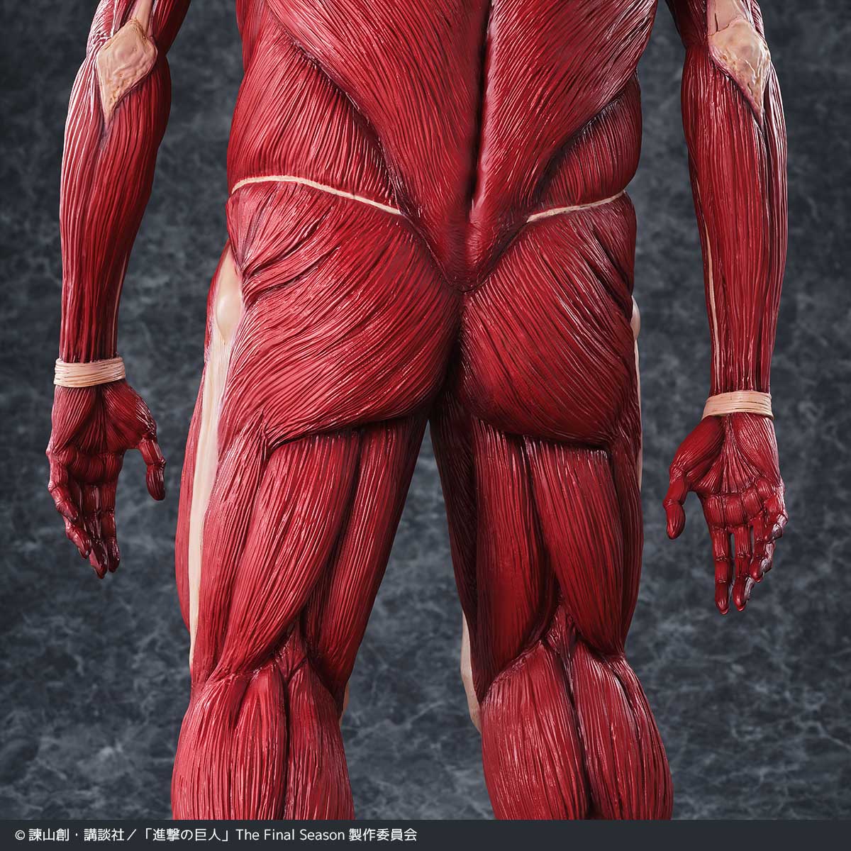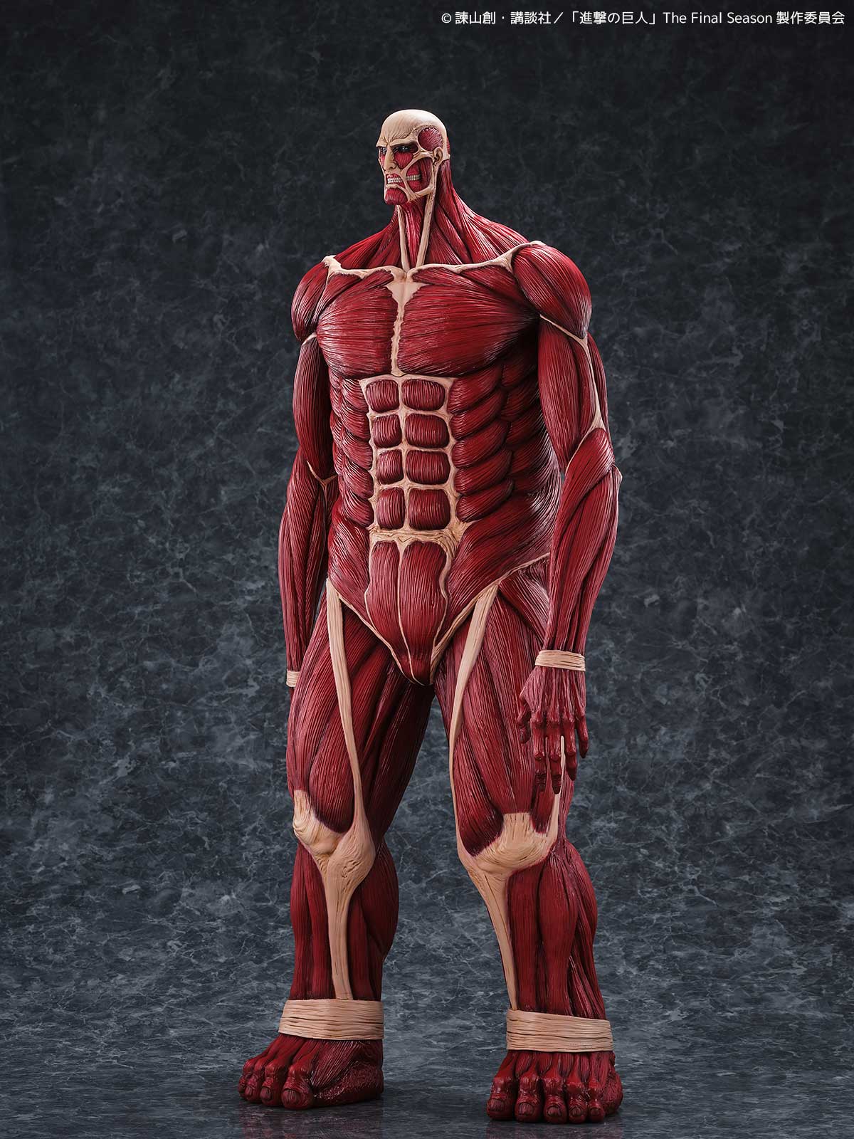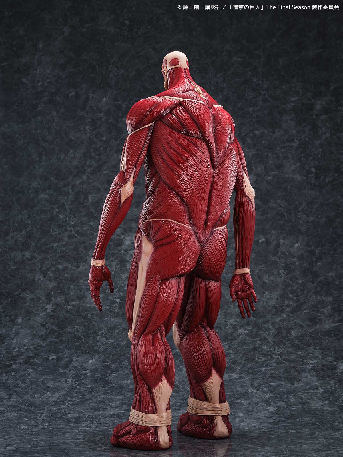 劇中では50メートルの壁の向こうからその姿を現した巨体を、全高63センチという圧巻のサイズで立体化。全身の筋繊維はこのスケールにふさわしい精密な造形で再現され、重厚な脚部、がっしりとした胴体、対照的に細身にも見える腕、見上げた際の遠近感を意識した小ぶりな頭部など、独特のプロポーションが「巨大さ」をより強調しています。