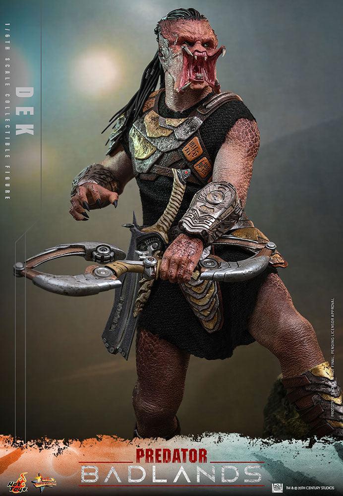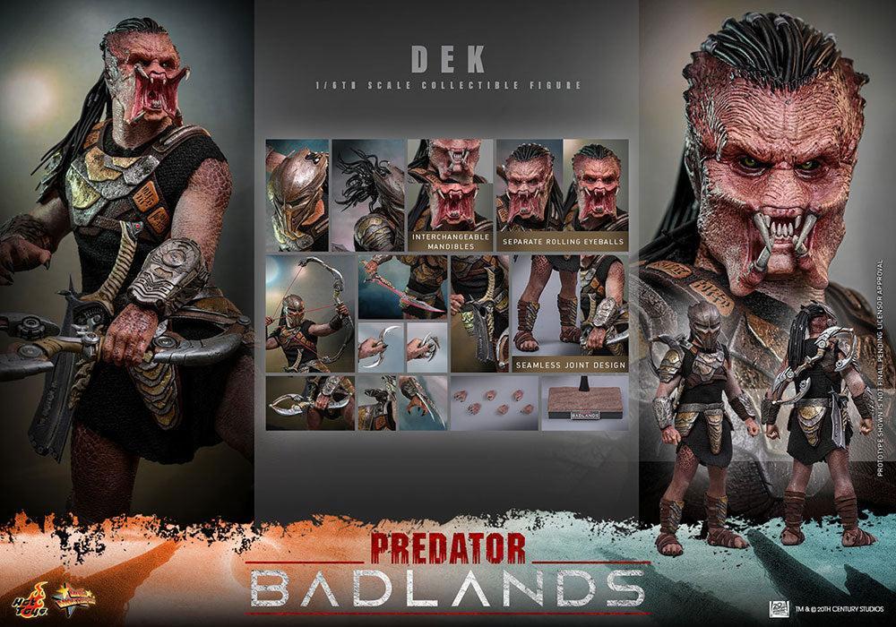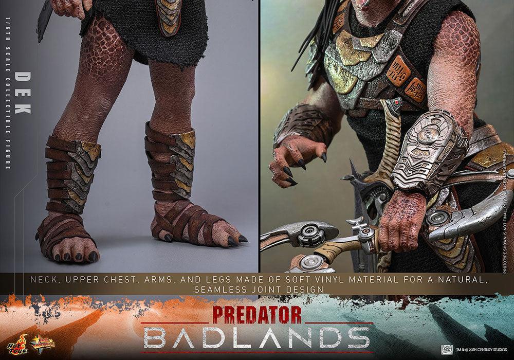 映画『プレデター:バッドランド』に登場するデクを、全高約31cm、16箇所以上が可動するハイエンドな1/6スケールのフィギュアとして立体化。新規開発となるヘッドは、眼球可動ギミックを搭載し、自由な視線変更によって、まるで生きているかのような存在感を醸し出すことが可能だ。爬虫類や両生類を彷彿させる特徴的な皮膚感を再現するため、一つひとつハンドペイントで塗装が施されている。顎は開いた状態と閉じた状態を差し替えが可能。また、リアルに造形されたドレッド風の髪は、乱れた状態の差し替えパーツによって、2通りのスタイルを演出できるぞ。新たに開発されたボディはビニール素材を採用し、首や肘、膝の関節をシームレスに再現。アーマーは業界トップクラスの塗装技術によって、擦り減った金属の質感を表現している。豊富な武器として、可動式のプラズマソード、弓矢、2種の手裏剣、左腕のガントレットに取り付けられるリストブレイド、肩に取り付けられるキャノンが付属。弓矢は折りたたむことができ、マグネットで背中に装着可能だ。また、腰に装着できる、収束状態のプラズマソードも付いてくる。さらに、着脱できるバイオマスクが付属するのも嬉しいポイントだ!差し替え用ハンドパーツを使用すれば、さまざまなアクションシーンを楽しむことができるぞ。ジオラマ風の台座は、「バッドランド」の地面をイメージした特別仕様となっている。